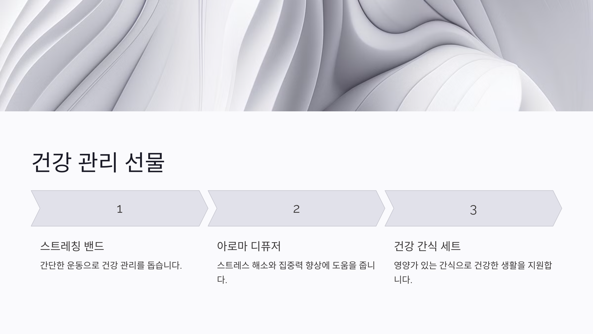 A6. 스트레칭 밴드, 아로마 디퓨저, 건강 간식 세트 등은 스트레스를 줄이고 건강한 생활을 돕는 실용적인 선물이 될 수 있어요.