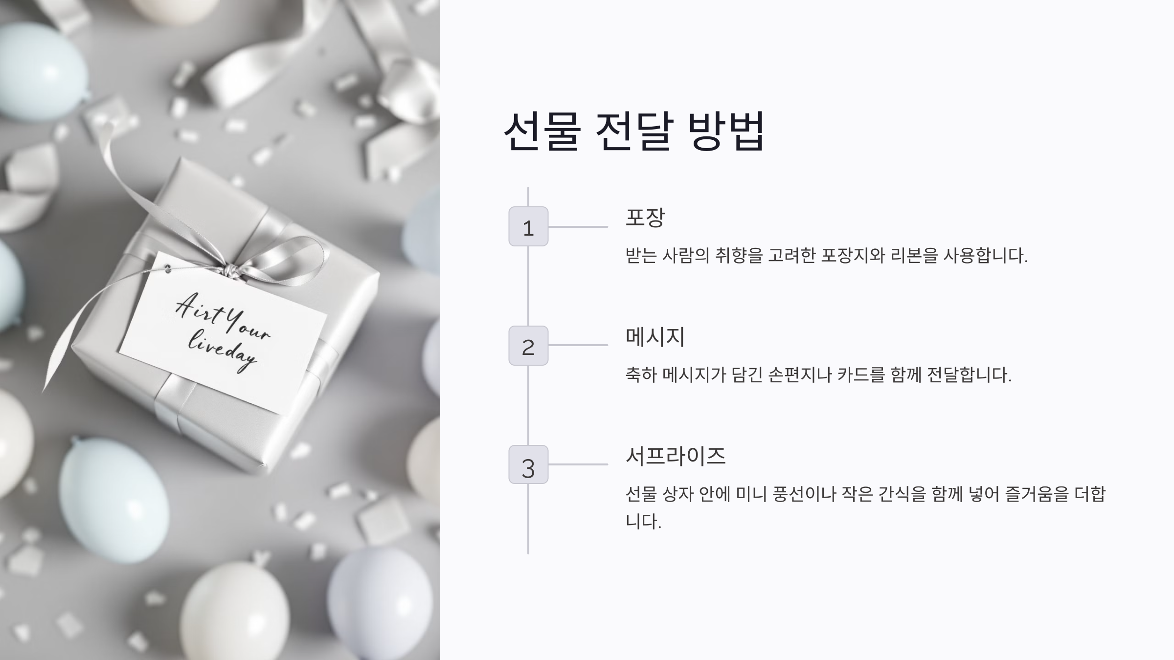 특별한 전달 방법을 원한다면, 작은 서프라이즈를 준비해 보세요. 예를 들어, 선물 상자 안에 미니 풍선이나 작은 간식을 함께 넣어 선물을 여는 순간을 더 즐겁게 만들 수 있어요. 깜짝 이벤트는 항상 좋은 추억을 남기게 해준답니다.