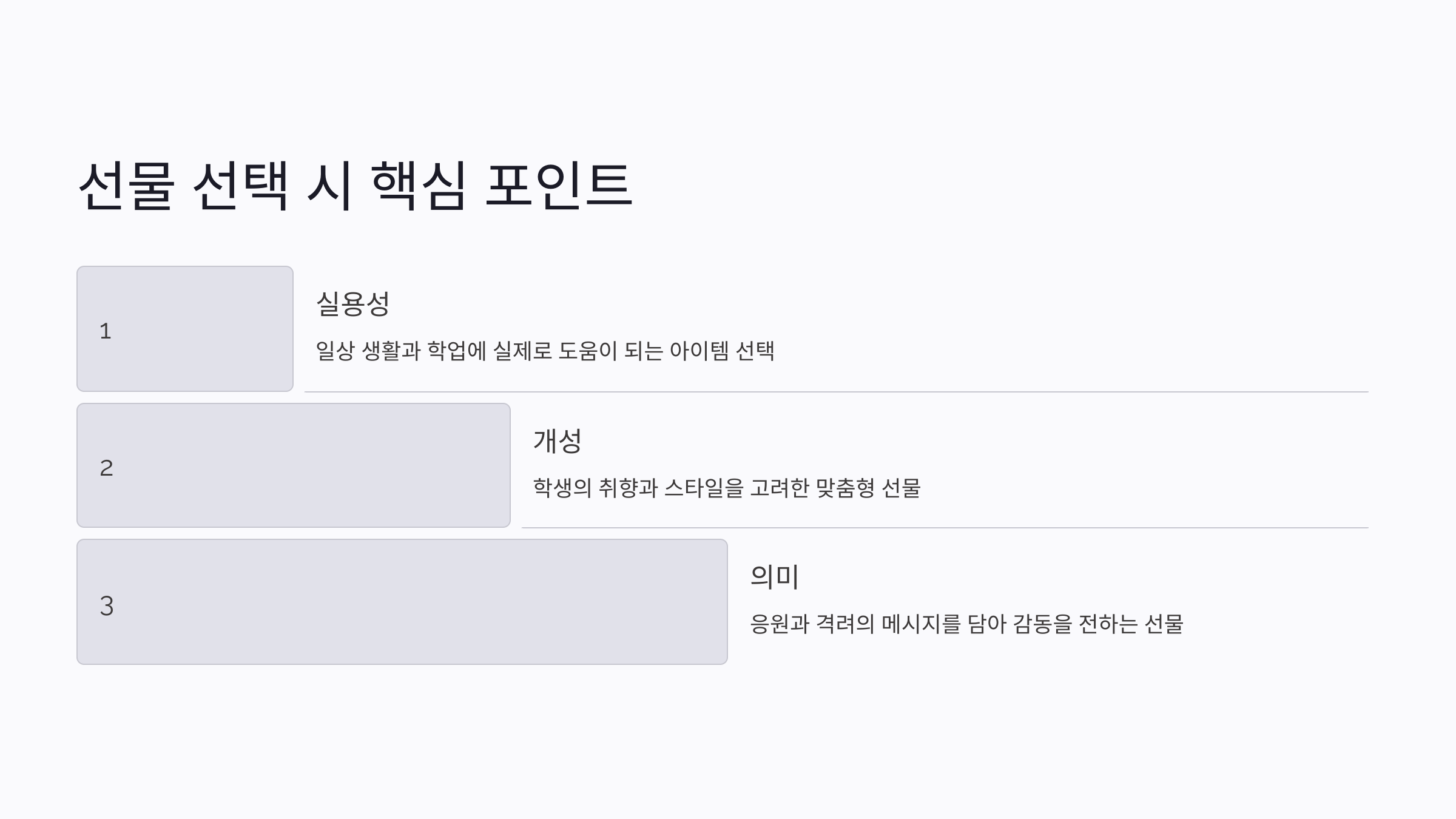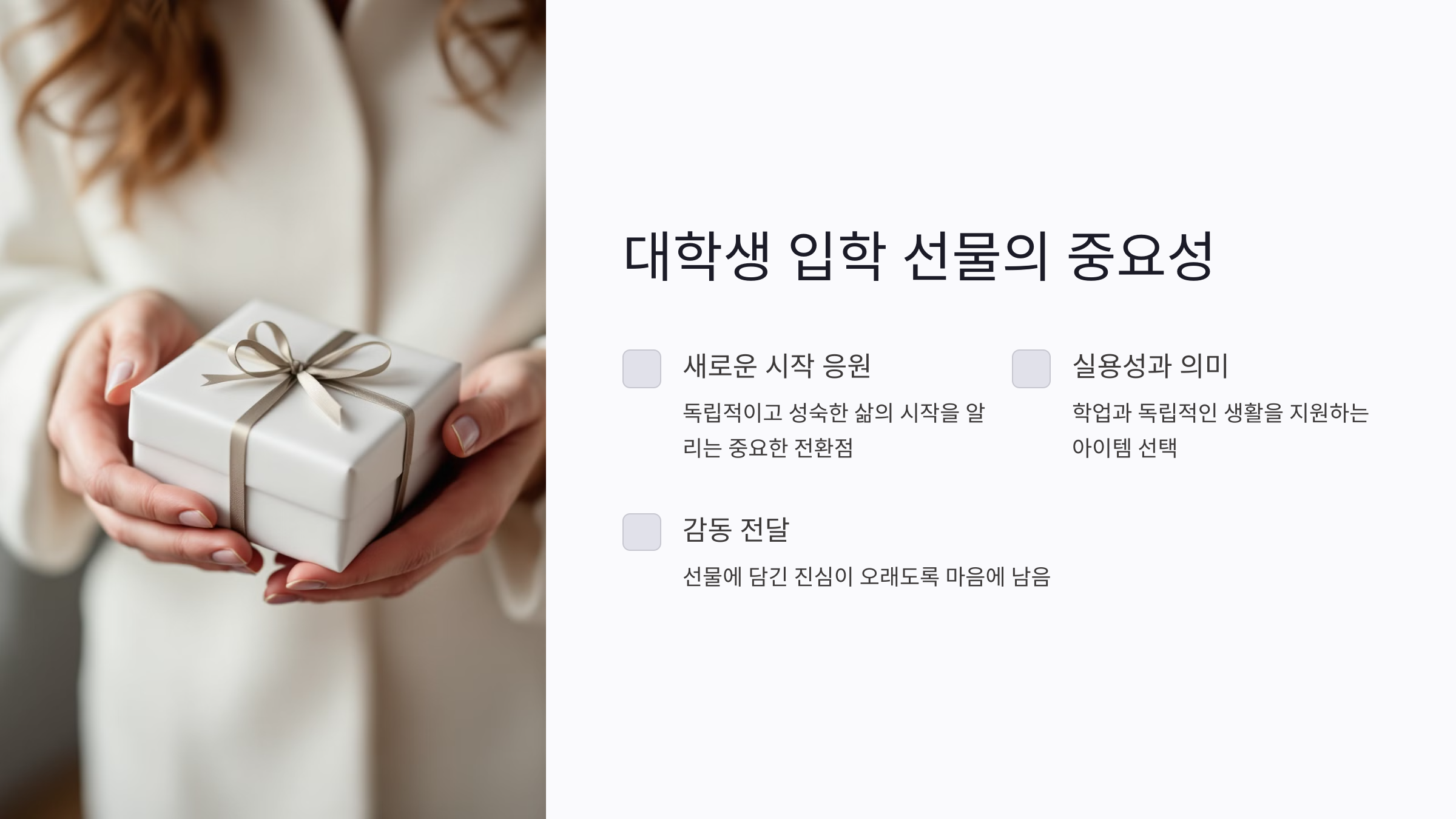 A8. 학생의 라이프스타일과 필요를 고려해 실용적이고 의미 있는 선물을 선택하는 것이 중요해요.