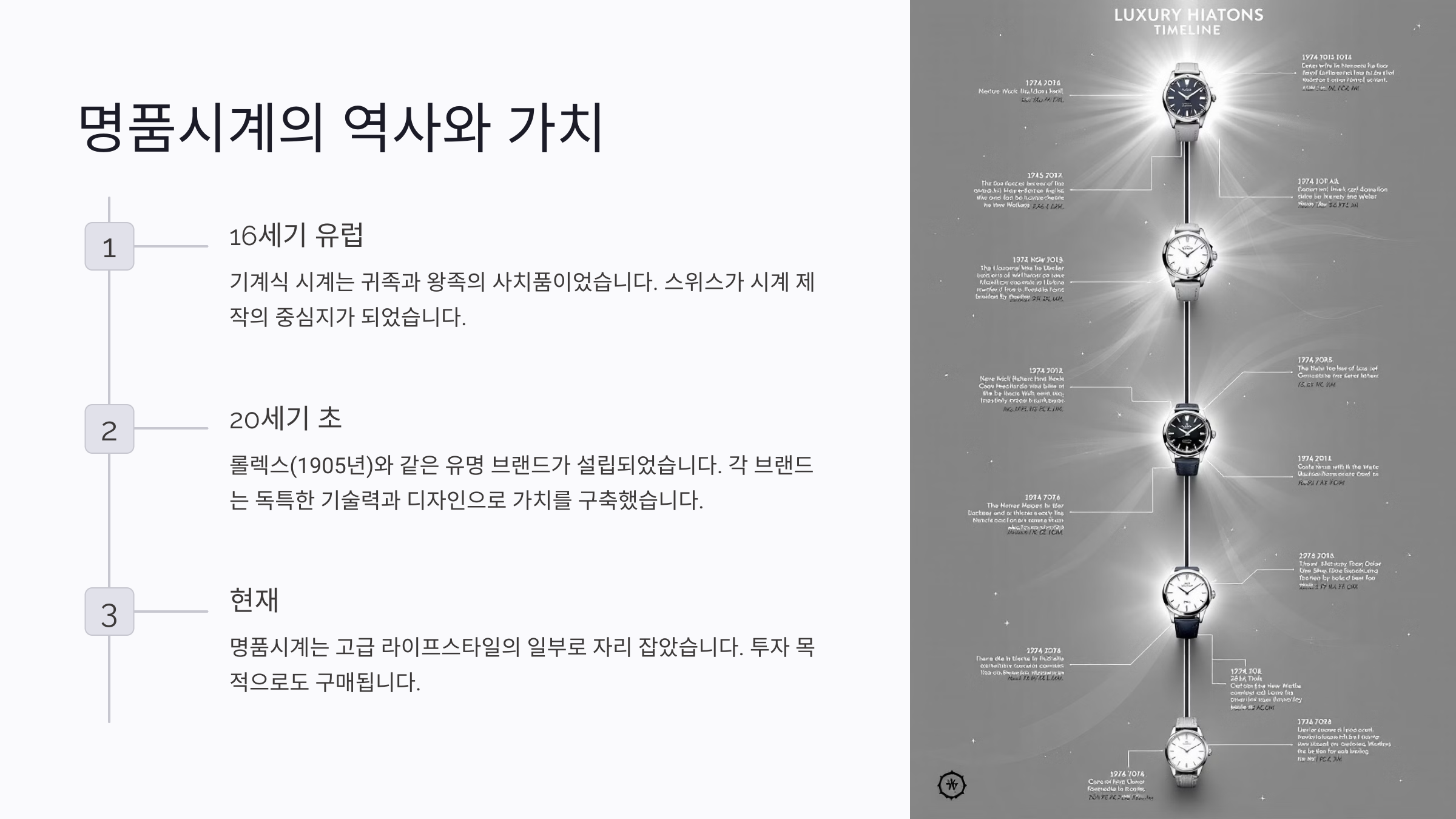 명품시계의 기원은 16세기 유럽으로 거슬러 올라가요. 당시 기계식 시계는 귀족과 왕족들만이 소유할 수 있는 사치품이었답니다. 스위스는 이러한 시계 제작 기술의 중심지가 되었고, 오늘날까지도 "스위스 메이드"라는 문구는 고급 시계의 상징으로 통하고 있어요. 이곳에서는 시계 제작의 정밀성과 미학적 디자인이 완벽하게 결합되었죠.