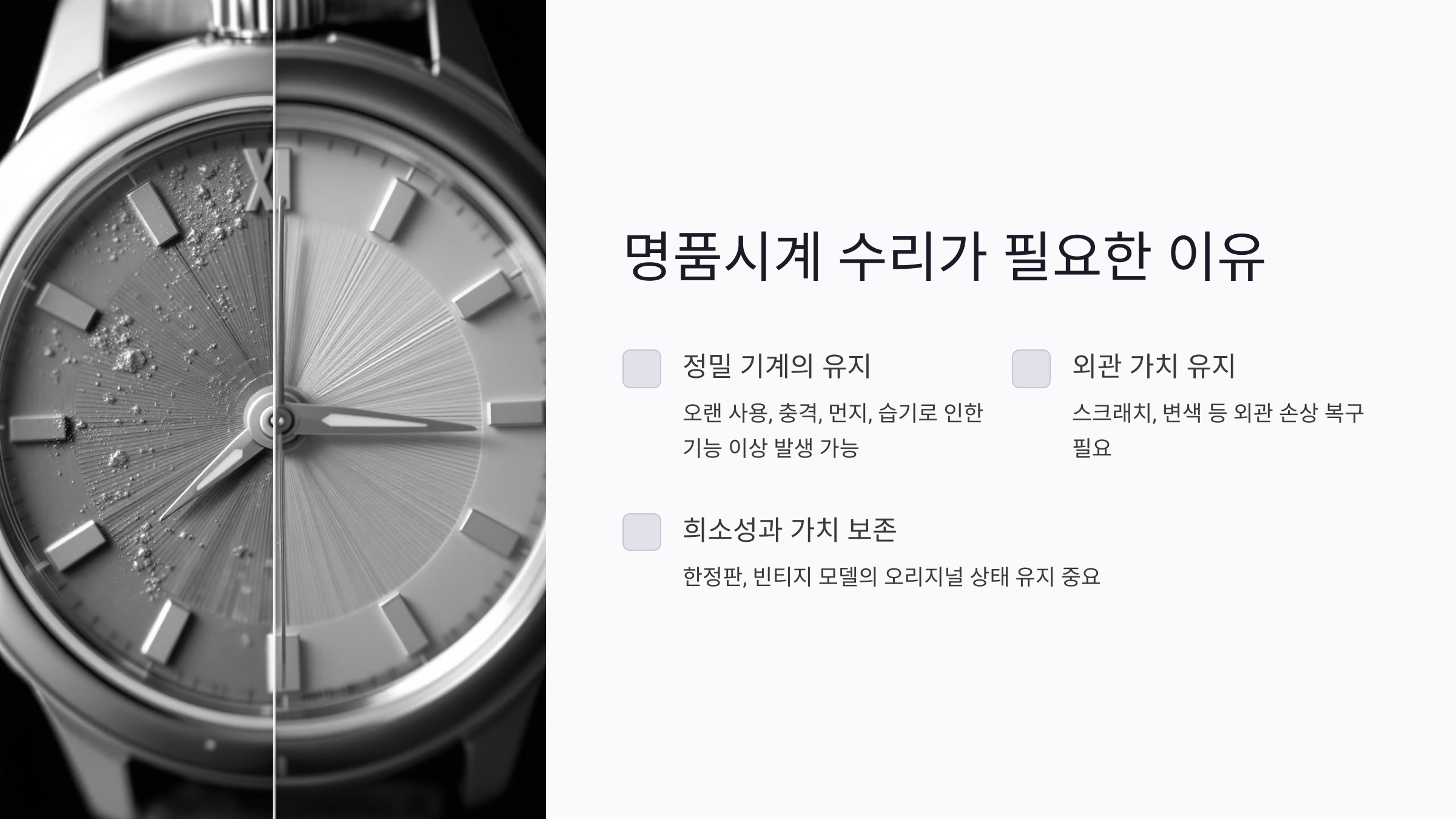 수리가 필요한 또 다른 이유는 희소성과 유지 가치 때문이에요. 예를 들어, 한정판 모델이나 빈티지 시계는 오리지널 상태를 최대한 유지해야 높은 가치를 보장받을 수 있어요. 따라서 단순히 작동 문제를 해결하는 것을 넘어, 시계의 역사와 디자인을 보존하는 데 중점을 두고 수리가 진행돼야 해요.