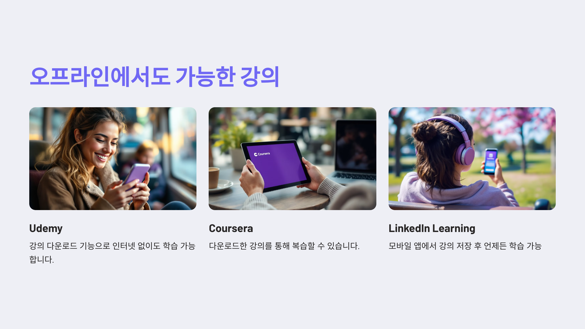 Udemy: 강의 다운로드 기능으로 인터넷 없이도 학습 가능합니다.