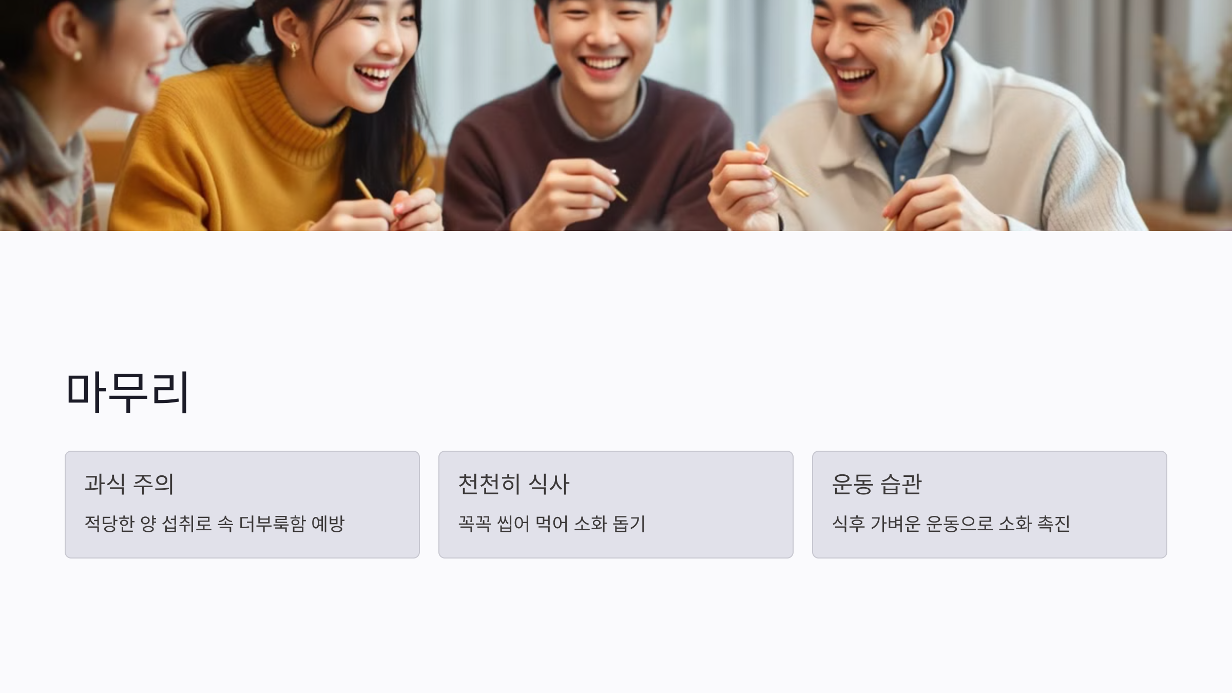 식사 중 천천히 꼭꼭 씹어 먹는 것도 효과적이에요. 음식물을 잘게 씹으면 위장이 음식을 처리하기가 훨씬 수월해져요. 빠르게 먹는 습관은 공기를 함께 삼킬 위험이 있어 속 더부룩함을 유발할 수 있으니 주의하세요.