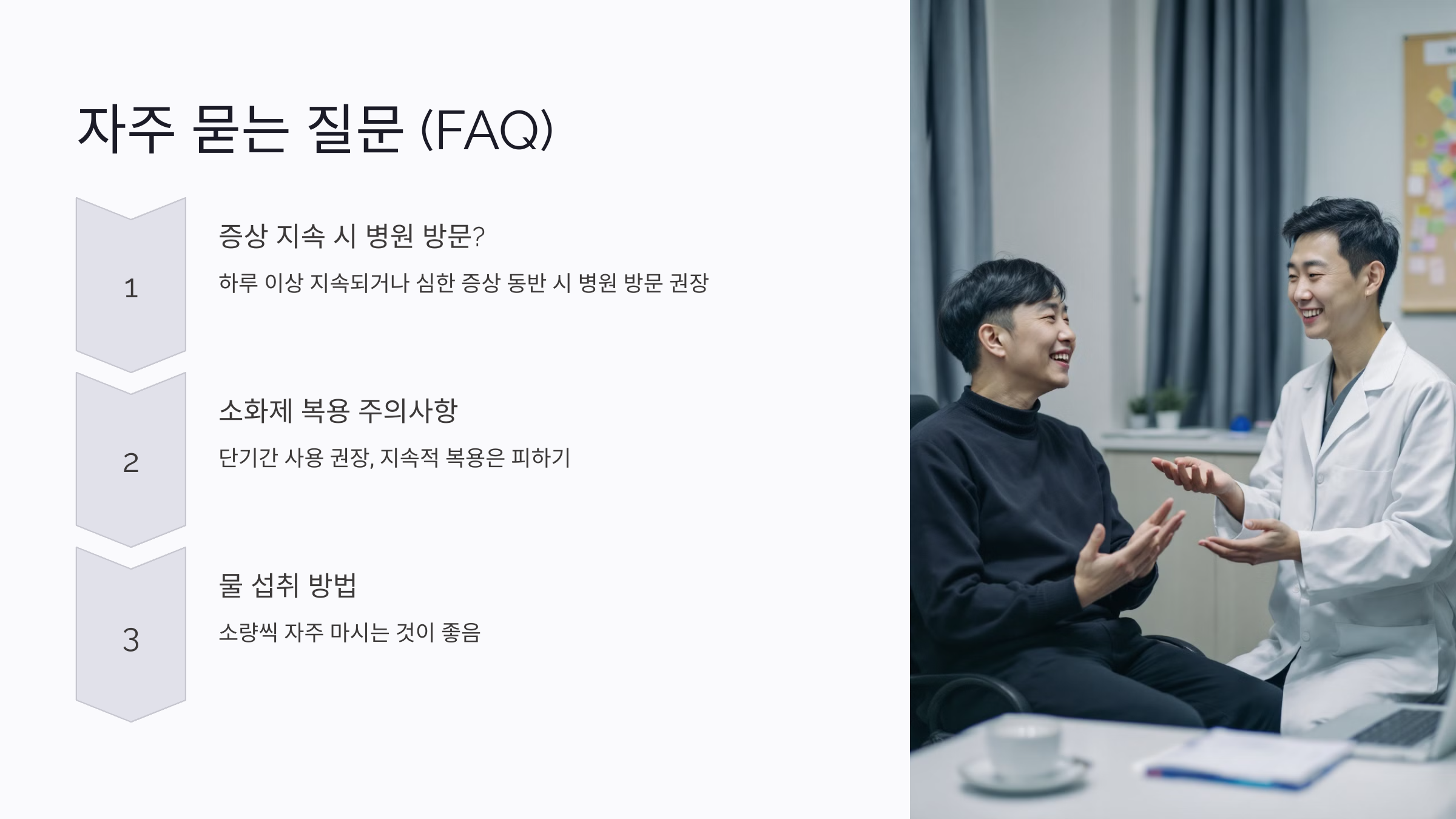 A3. 물은 소량씩 자주 마시는 것이 좋아요. 한꺼번에 많은 양을 마시면 오히려 속이 더 답답해질 수 있어요.