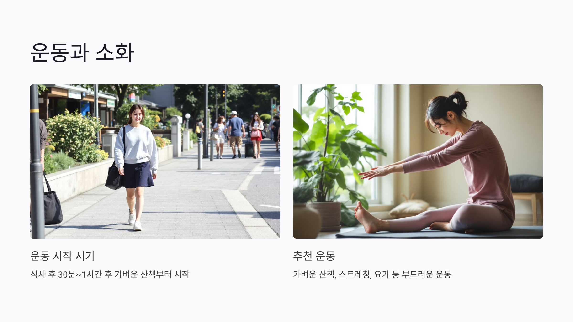 A4. 식사 직후에는 무리한 운동을 피하고, 30분~1시간 후 가벼운 산책 정도로 시작해 보세요. 운동은 소화를 돕는 데 좋아요.