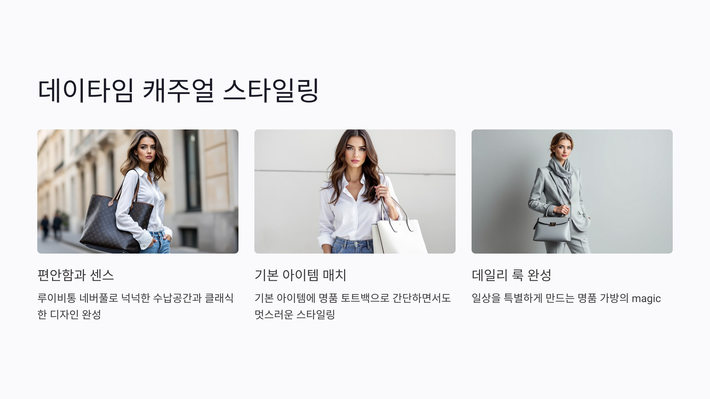 데이타임 캐주얼 스타일링은 간편함과 세련됨의 조화가 핵심이에요. 너무 화려하거나 복잡한 디테일보다는 심플하면서도 실용적인 명품 가방을 선택하면 더 오래 사랑받을 수 있는 코디를 완성할 수 있어요.