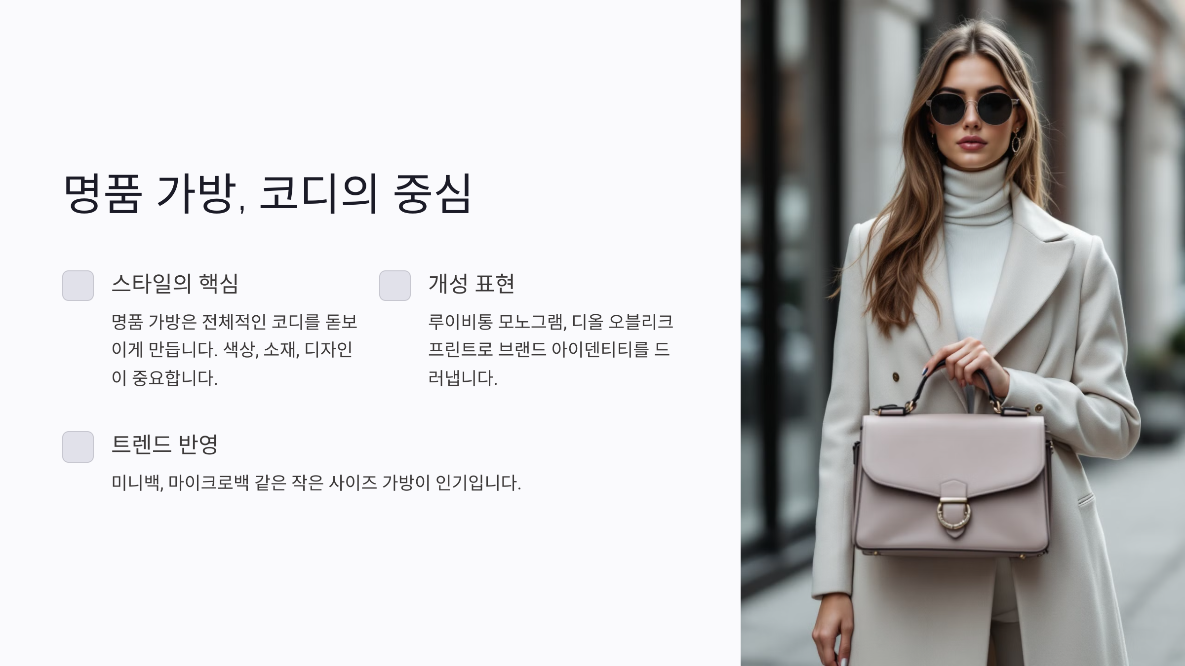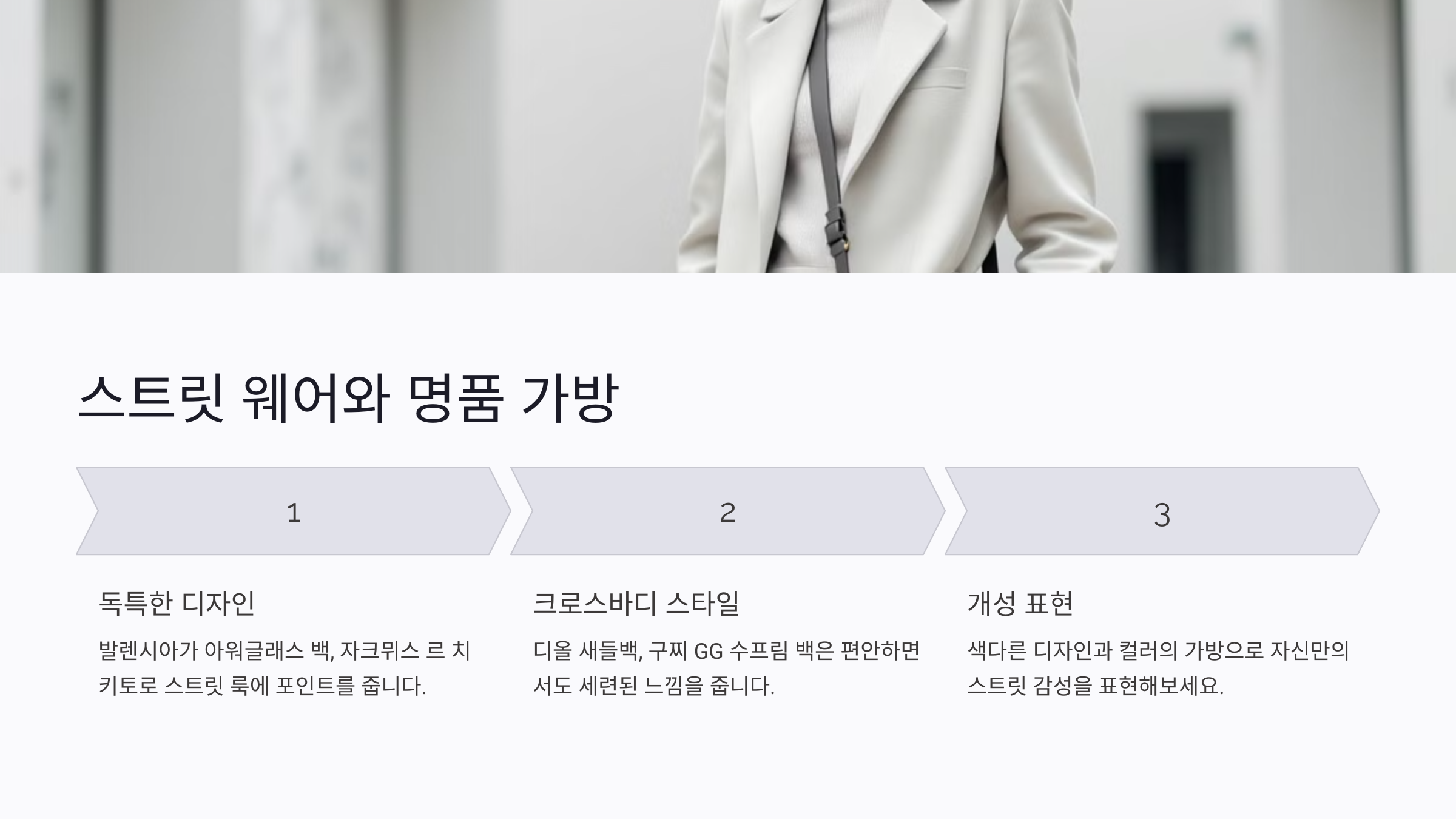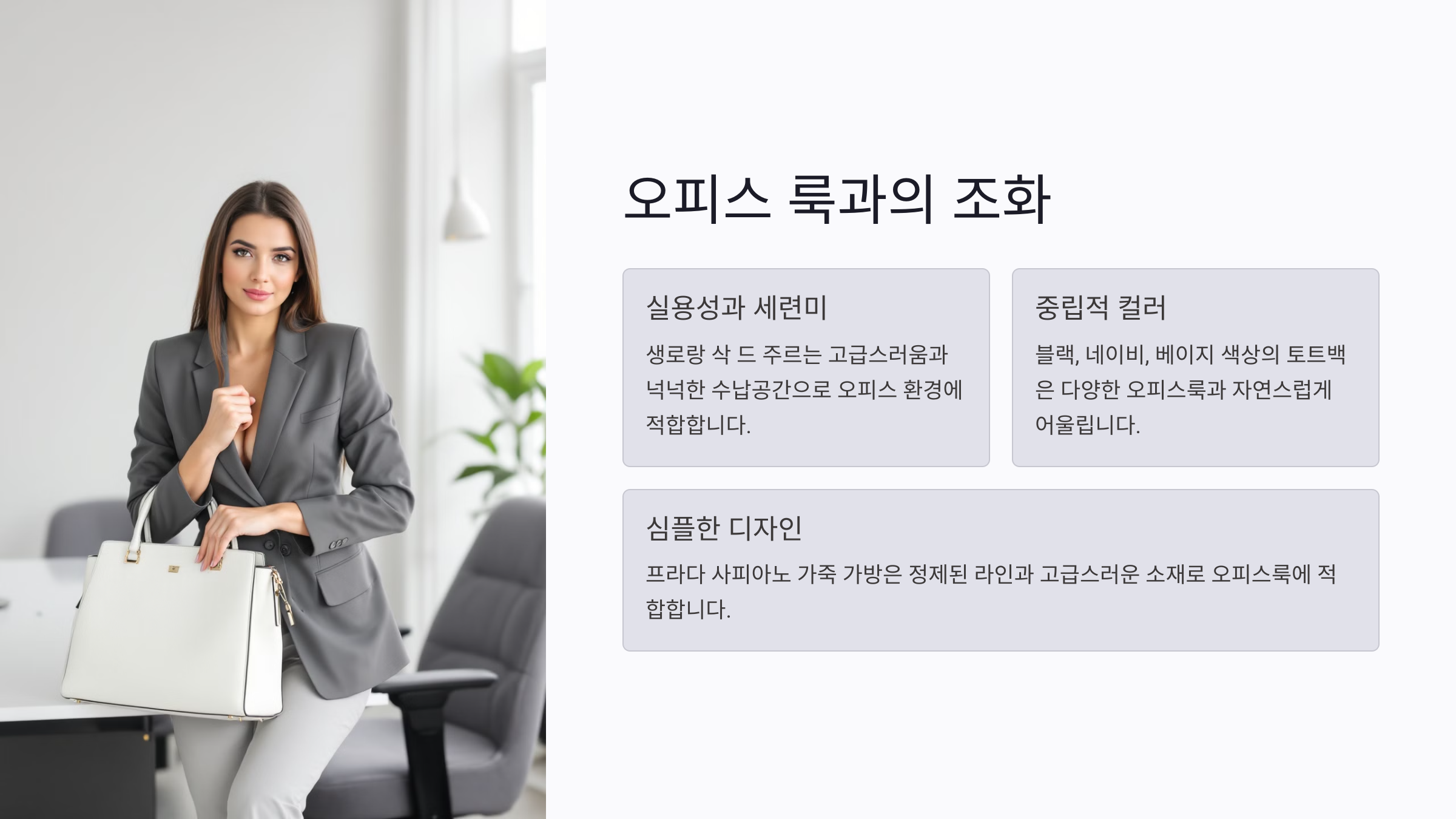오피스룩 스타일링은 안정적이고 믿음직스러운 이미지를 주는 것이 중요해요. 명품 가방을 활용해 단정하면서도 프로페셔널한 분위기를 완성해 보세요.