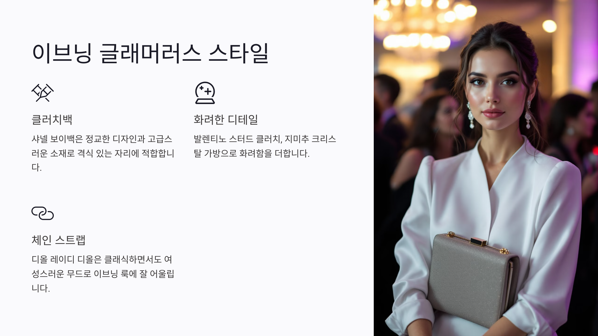 이브닝 스타일링에서는 가방의 디테일과 소재 선택이 중요해요. 메탈릭, 글리터, 크리스탈 등 빛나는 소재는 화려한 분위기를 강조하며, 포멀한 자리에서도 눈길을 사로잡을 수 있어요.