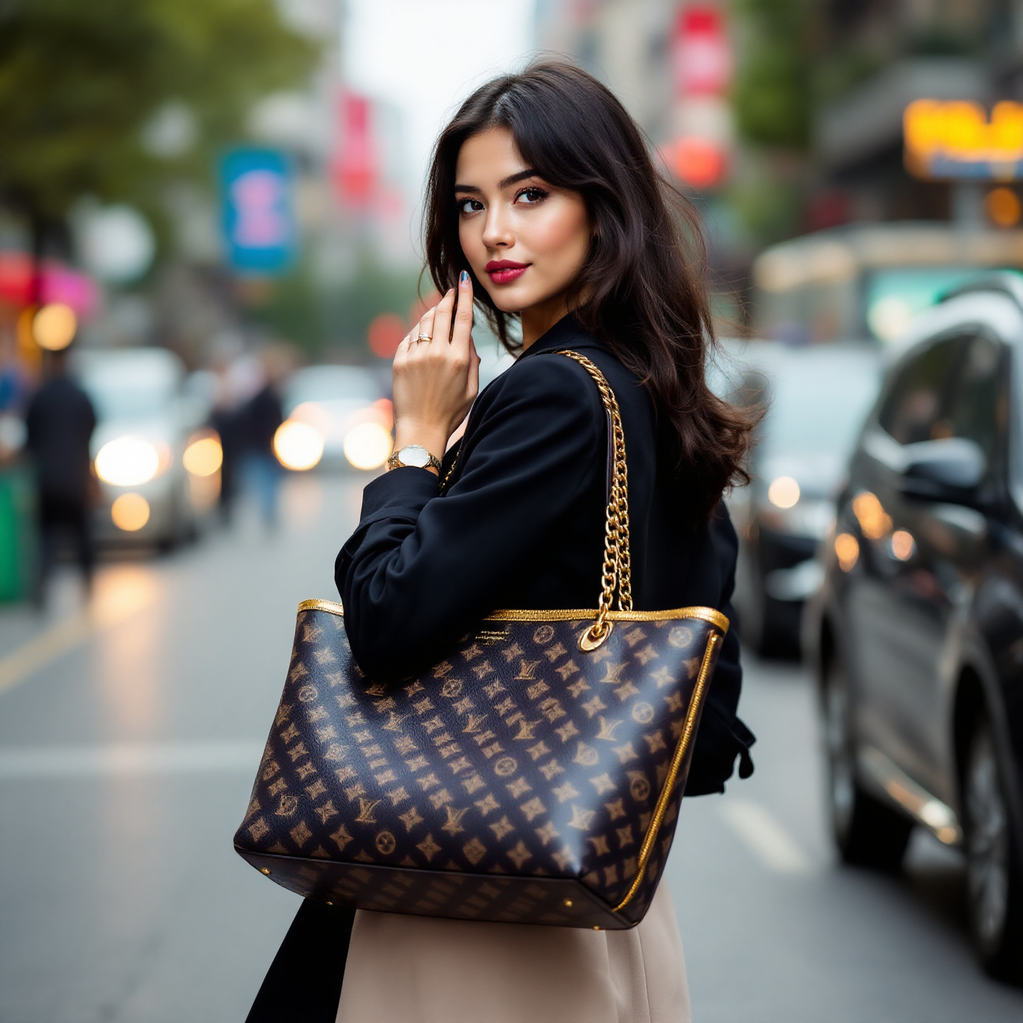 블랙, 네이비, 베이지 같은 중립적인 컬러의 토트백은 다양한 오피스룩과 자연스럽게 조화를 이뤄요. 루이비통의 온더고(OnTheGo)는 실용성과 세련됨을 동시에 갖춘 모델로, 문서와 노트북을 담기에 충분한 크기라 추천할 만해요.