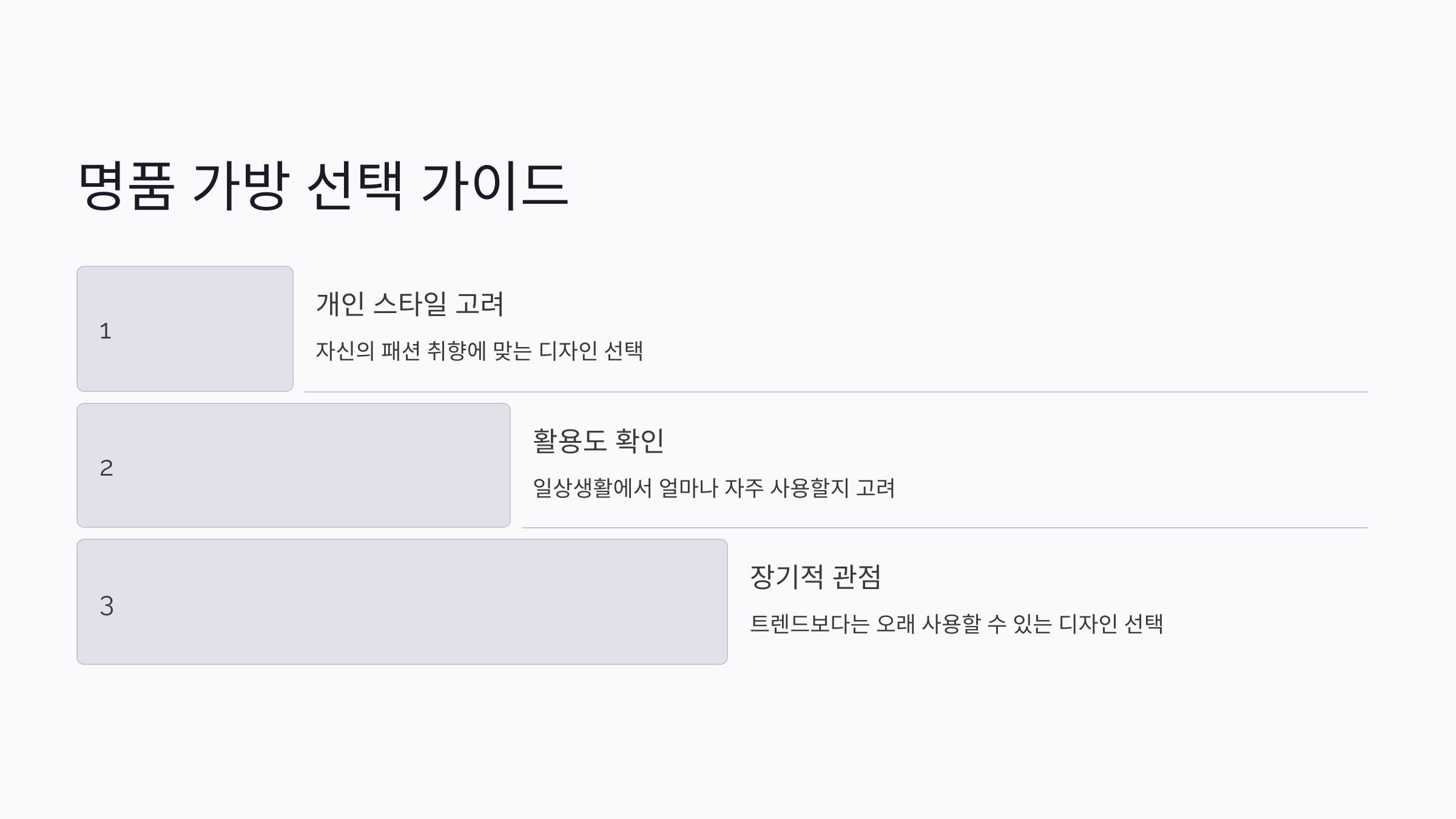 A5. 자신의 스타일과 활용도를 고려해 선택하세요. 너무 트렌드에만 치우치지 말고, 오랜 시간 사용할 수 있는 디자인과 색상을 선택하는 것이 좋아요.