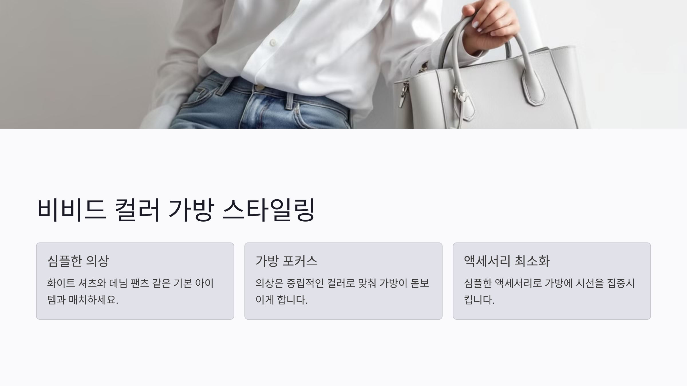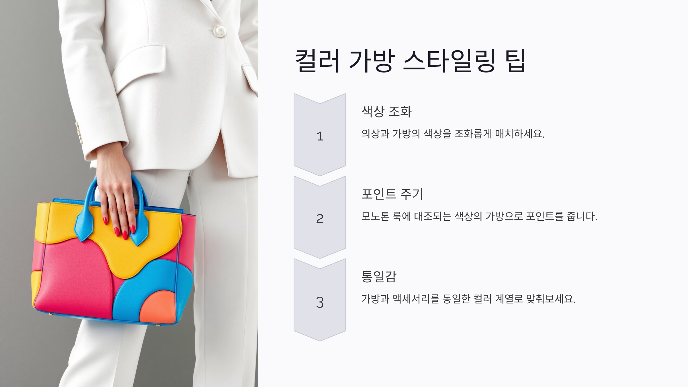 비비드 컬러 가방은 단순히 트렌디한 아이템을 넘어, 스타일링의 핵심 포인트로 작용해요. 이런 대담한 색상을 선택할 때는 옷과 액세서리를 심플하게 맞춰 가방이 돋보이게 연출하는 것이 중요해요.