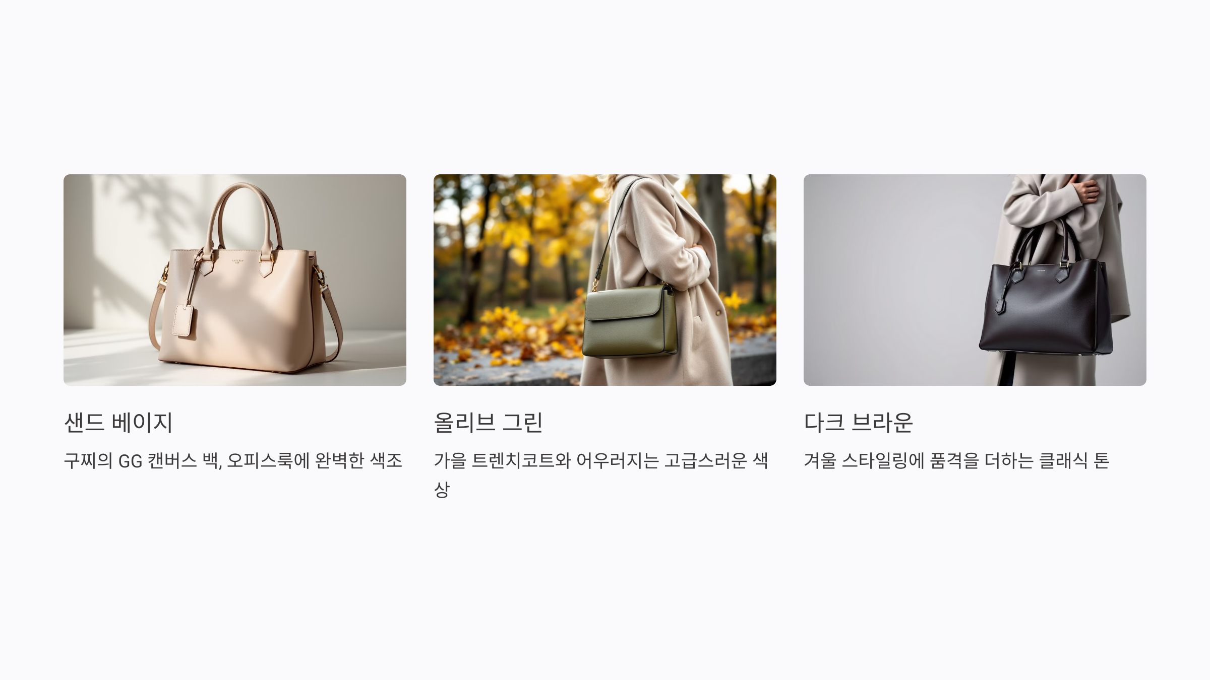 특히 샌드 베이지와 토프 컬러는 계절에 상관없이 활용도가 높아요. 구찌의 GG 캔버스 백이나 프라다의 사피아노 라인 가방은 뉴트럴 톤의 대표적인 예로, 오피스룩이나 격식을 갖춘 자리에서도 세련된 이미지를 연출할 수 있어요.