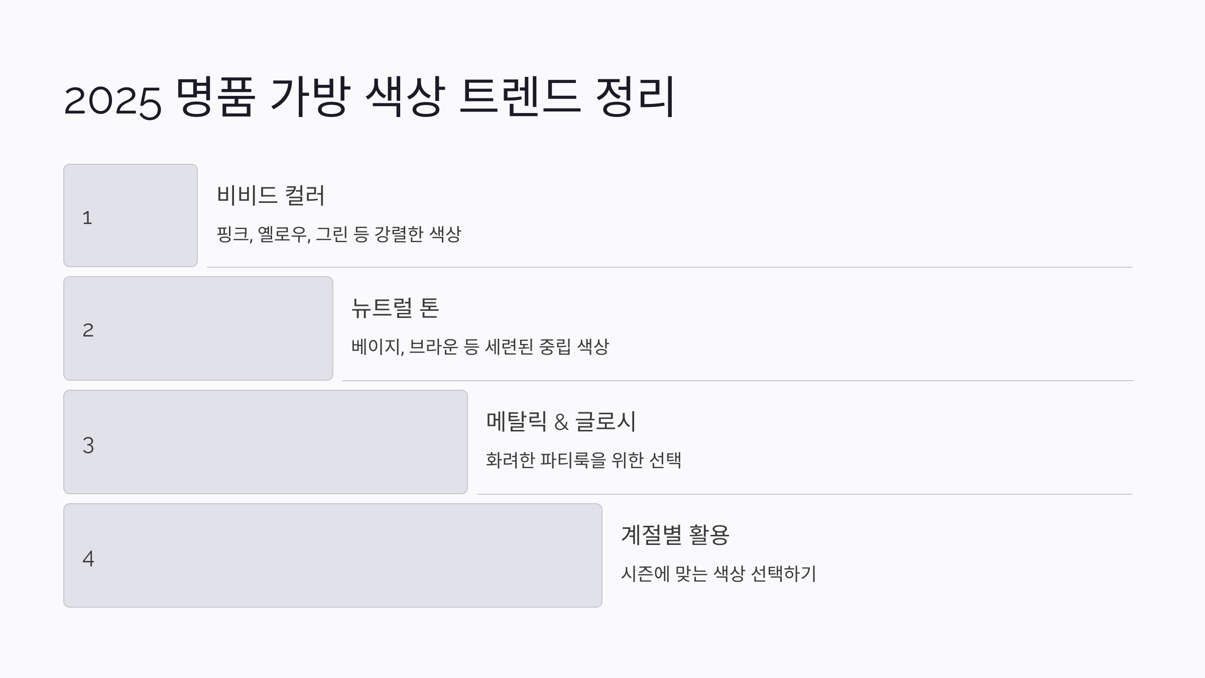 명품 가방의 색상은 매년 새로운 트렌드를 만들어내며, 스타일링에 중요한 역할을 해요. 2025년에도 독창적이고 대담한 컬러가 주목받고 있으며, 비비드한 색감부터 차분한 뉴트럴 톤까지 다양한 선택지가 유행을 주도할 예정이에요. 이런 컬러 트렌드를 잘 활용하면 스타일링을 한층 더 완성도 있게 만들 수 있답니다.