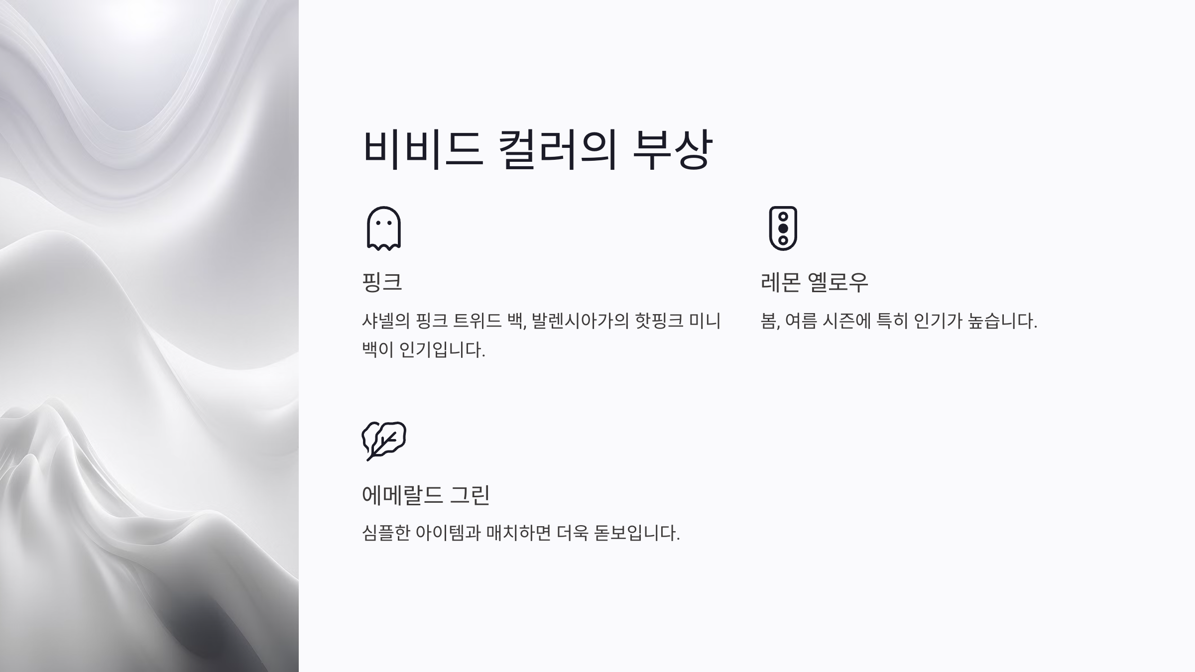 특히 핑크 컬러는 올해의 강력한 트렌드로 자리 잡았어요. 샤넬의 핑크 트위드 백이나 발렌시아가의 핫핑크 미니백은 캐주얼 룩과 포멀 룩 어디에나 포인트 아이템으로 활용할 수 있어요. 강렬한 핑크는 자신감과 활력을 상징하는 컬러로, Z세대 소비자들에게 큰 사랑을 받고 있어요.