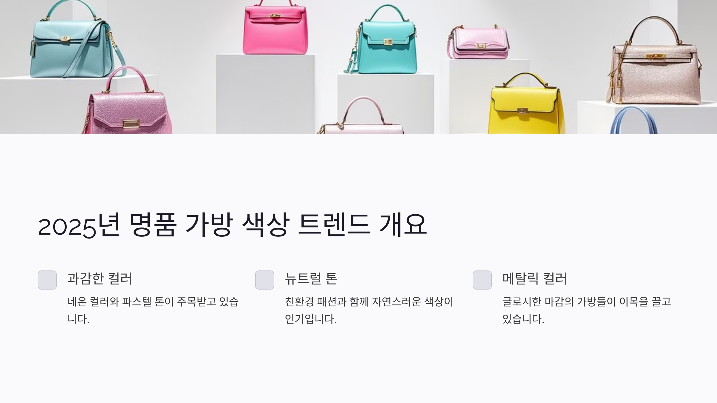 이번 아티클에서는 2025년에 유행할 명품 가방 색상 트렌드와 이를 활용한 스타일링 팁을 소개할게요. 색상의 매력을 활용해 자신의 스타일에 새로운 변화를 줄 수 있는 방법을 알아보세요!