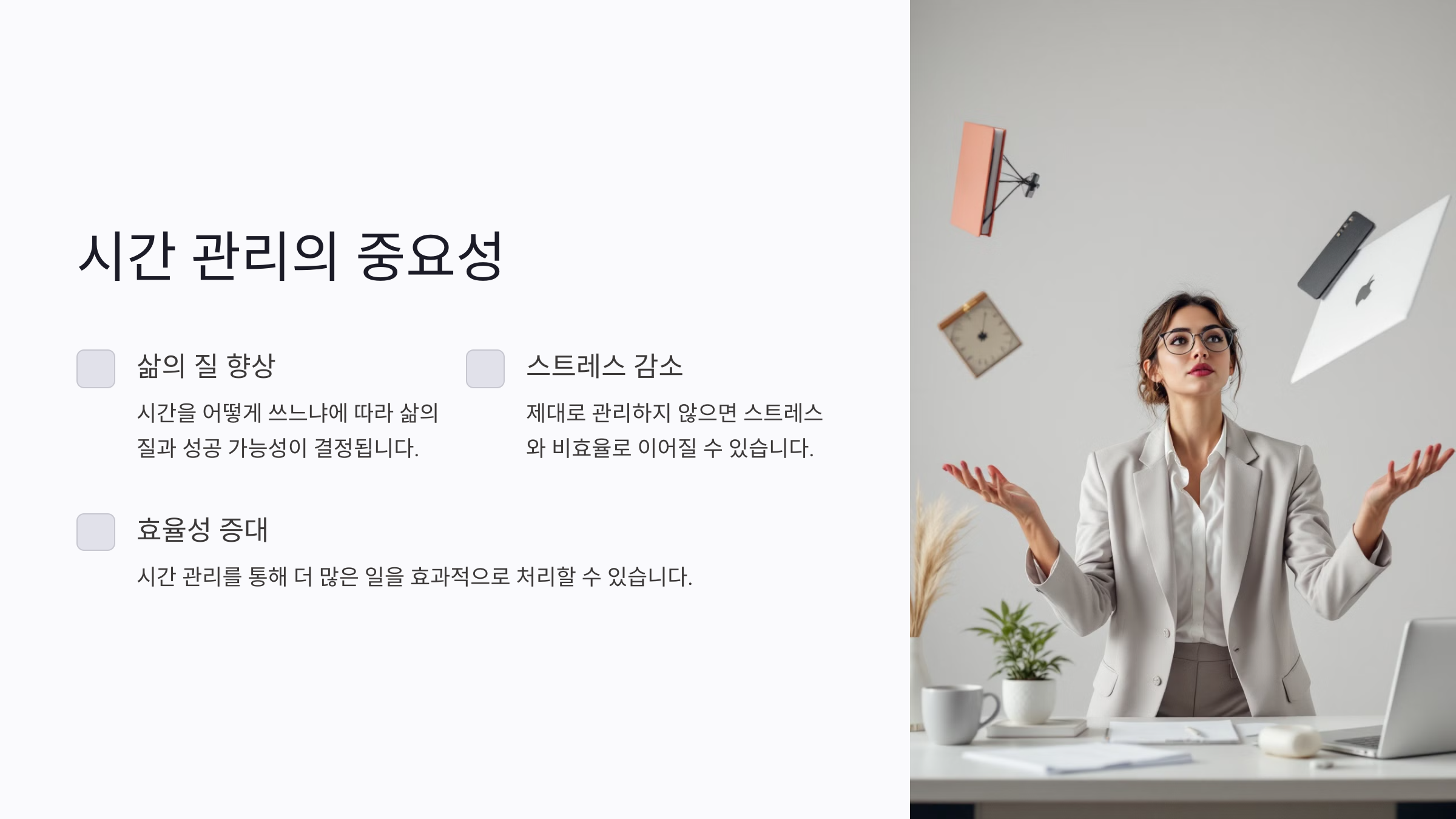 시간 관리는 단순히 바쁜 스케줄을 정리하는 것이 아니에요. 시간을 어떻게 쓰느냐에 따라 삶의 질과 성공 가능성이 결정되죠. 시간은 한정된 자원이기 때문에, 제대로 관리하지 않으면 스트레스와 비효율로 이어질 수밖에 없어요.