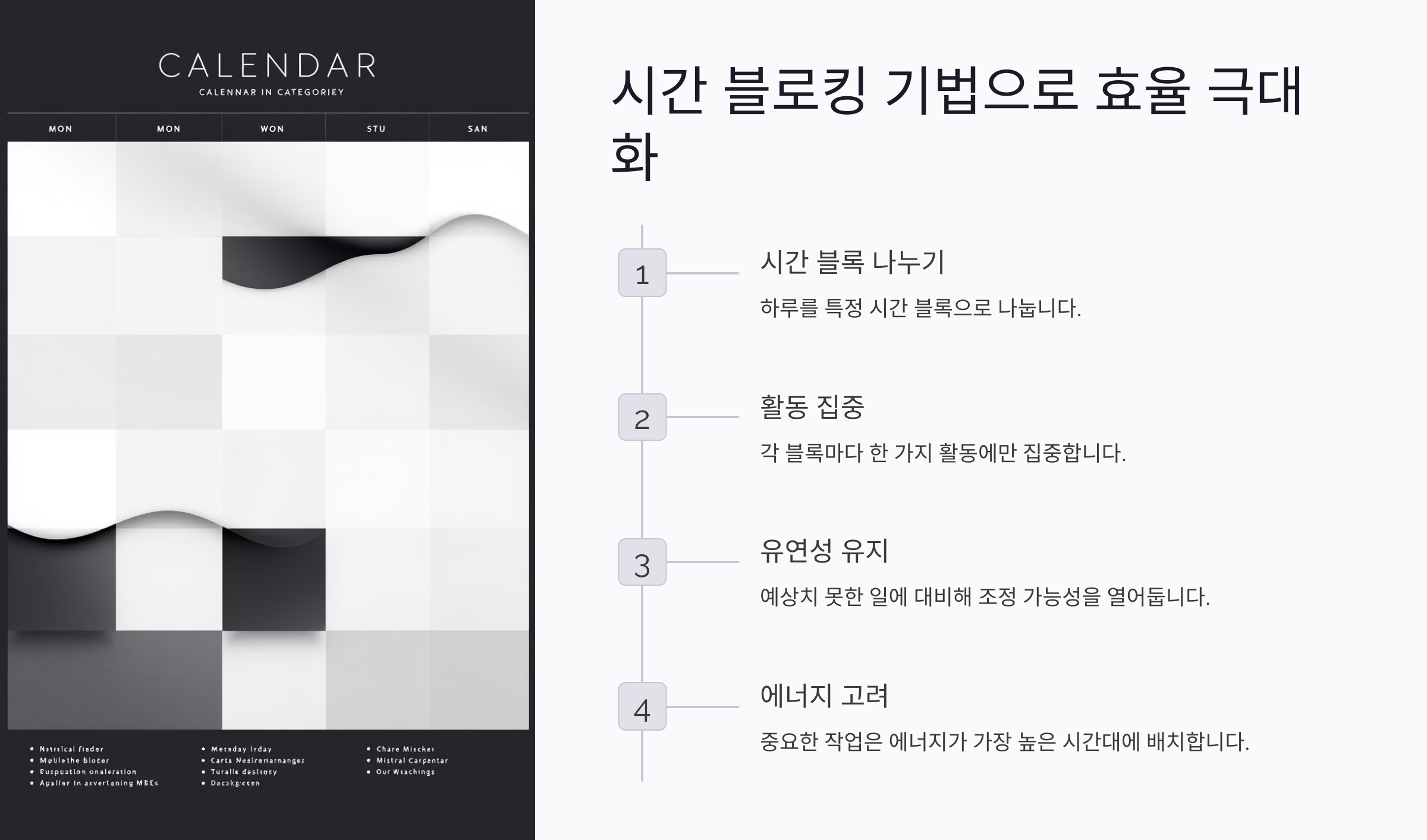 시간 블로킹의 핵심은 유연성이에요. 예상치 못한 일이 생기더라도 일정에 조정 가능성을 열어두면 스트레스 없이 계획을 실행할 수 있어요. 너무 타이트한 블로킹은 오히려 독이 될 수 있답니다.