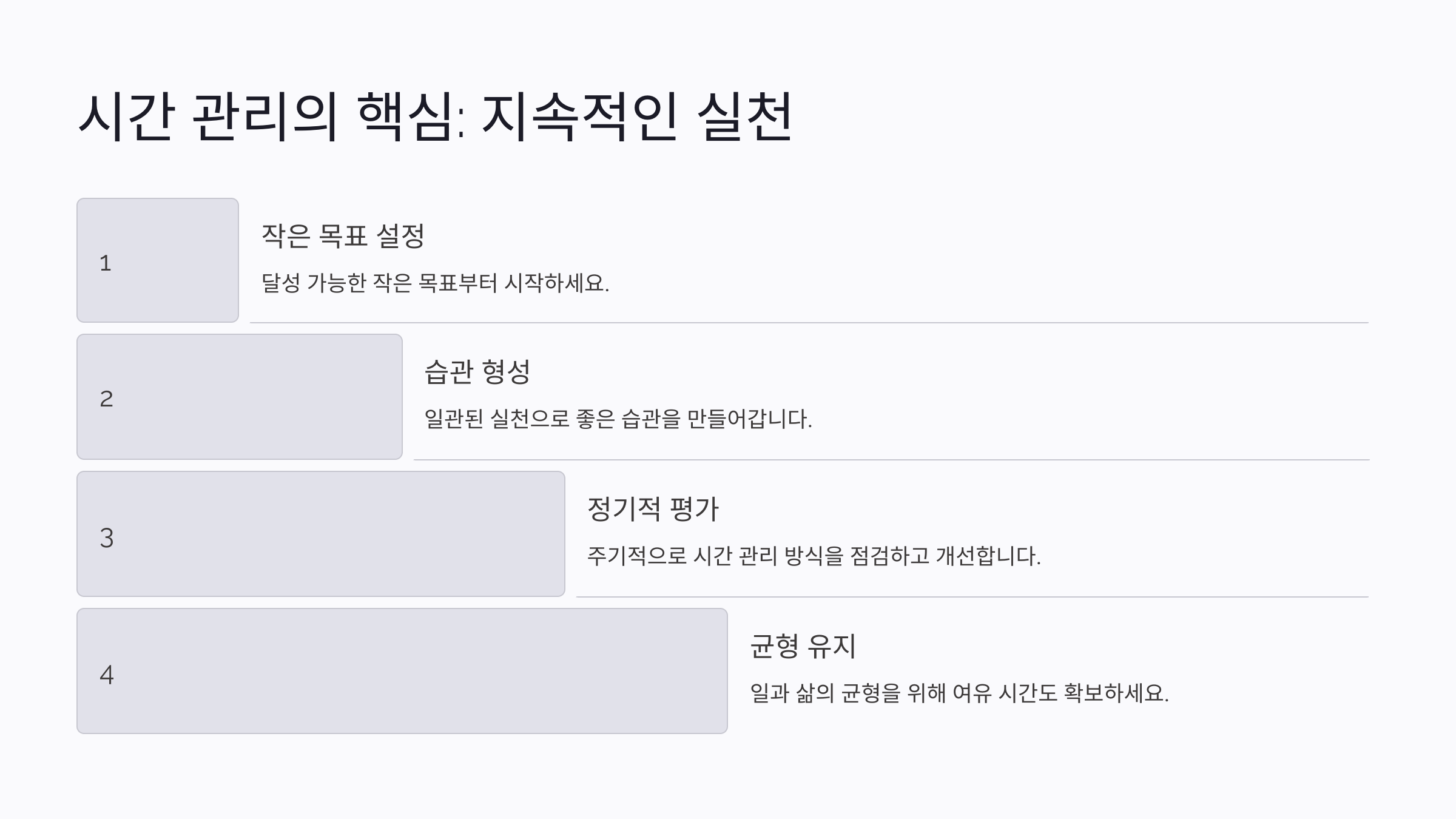마지막으로는 작은 습관의 힘을 믿는 것이에요. 하루 10분씩 시간을 투자해 중요한 일을 조금씩 처리하다 보면, 작은 변화가 쌓여 큰 결과로 이어져요. 한국에서 일과 생활의 균형을 맞추는 워라밸(Work-Life Balance) 문화도 점점 강조되고 있어요.