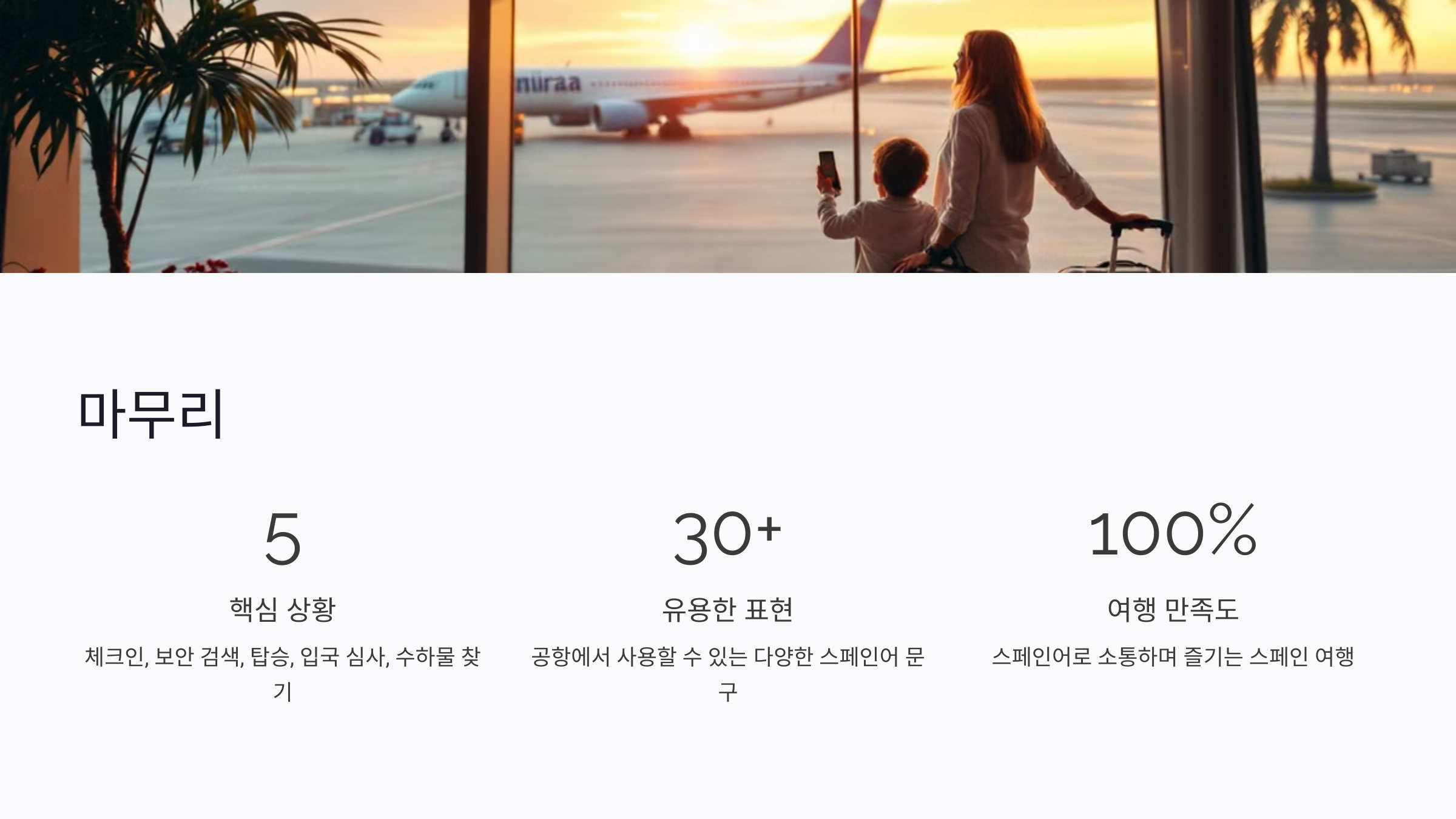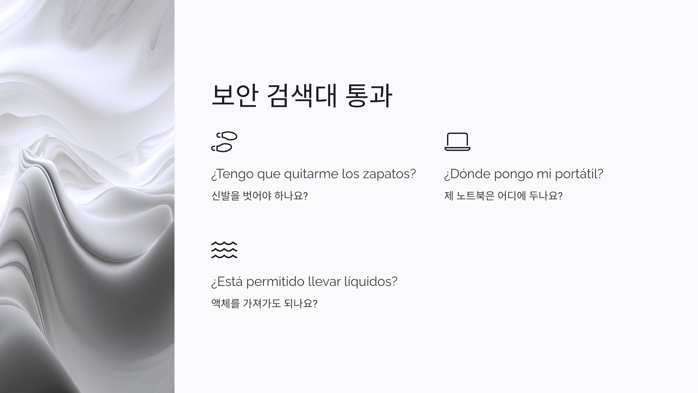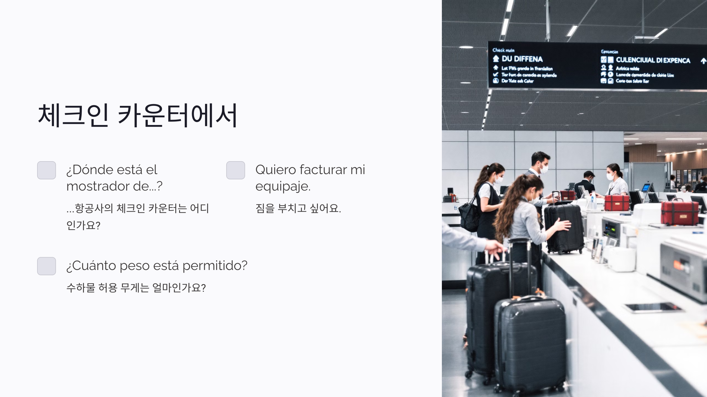 스페인 여행을 시작하면서 가장 먼저 접하게 되는 곳은 공항이에요. 체크인, 보안 검색, 입국 심사 등 여러 단계를 거치게 되는데요, 이때 기본적인 스페인어 표현 몇 가지를 알고 있다면 여행을 더 편리하게 즐길 수 있어요.