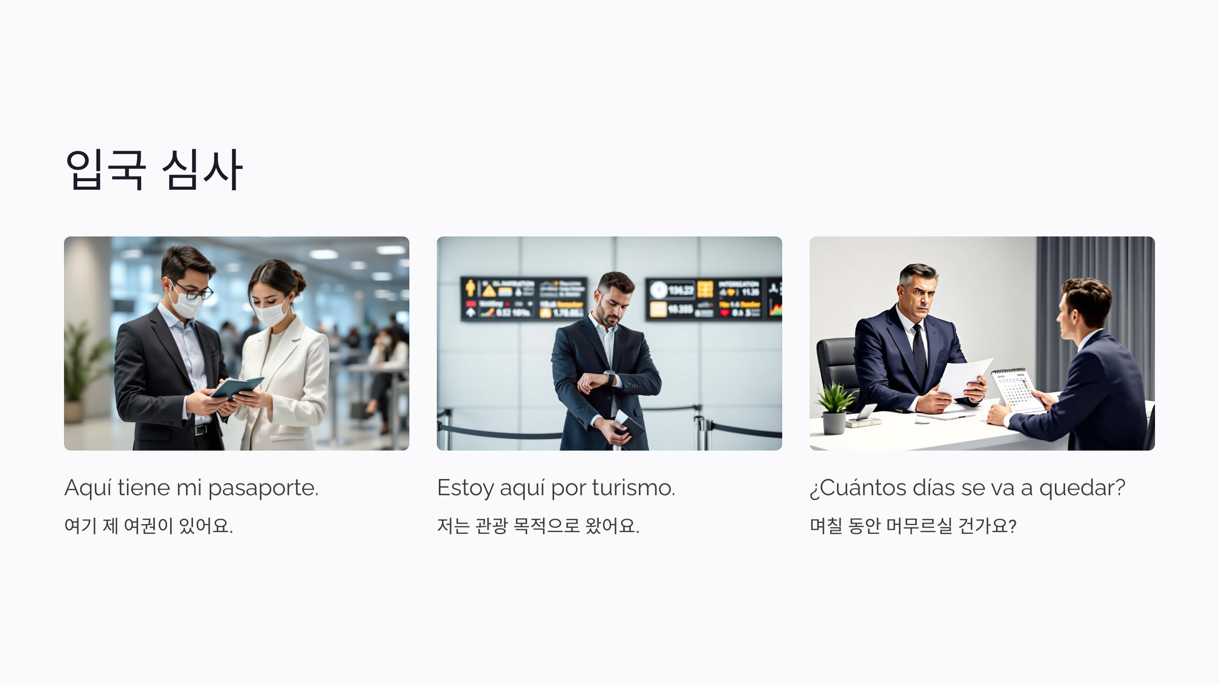 입국 심사는 공항에서 가장 긴장되는 단계일 수 있지만, 몇 가지 스페인어 표현만 알고 있으면 쉽게 대처할 수 있어요: