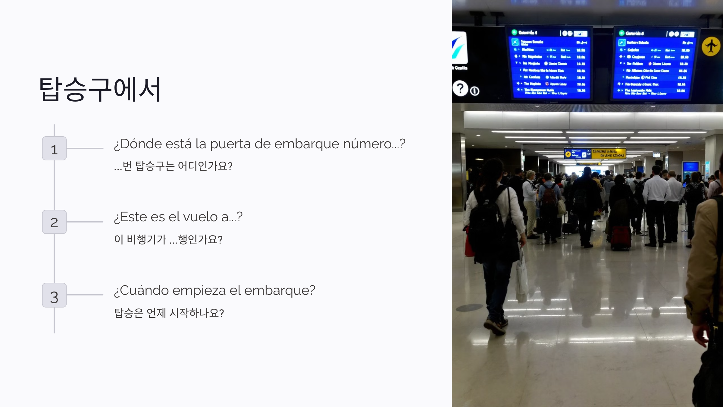 1. ¿Dónde está la puerta de embarque número...? (돈데 에스타 라 뿌에르따 데 엠바르께 누메로...?)