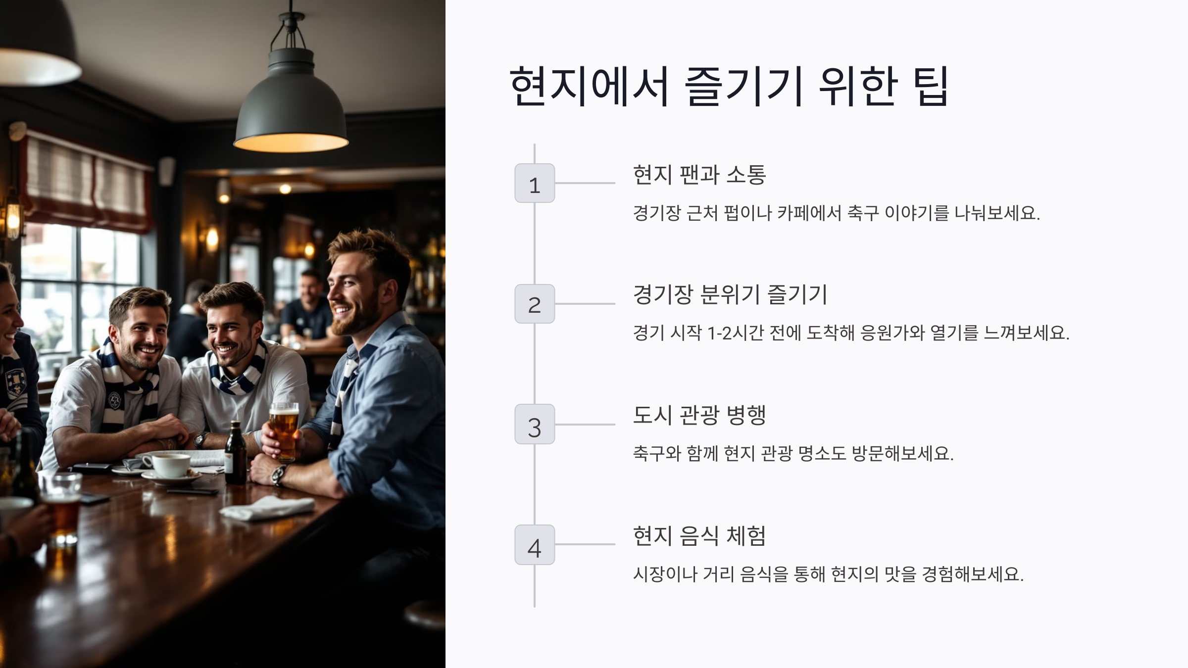 현지에서 축구 여행을 최대한 즐기려면 몇 가지 팁을 알아두는 것이 좋아요. 먼저, 현지 팬들과 소통할 기회를 가져보세요. 경기 전후로 경기장 근처 펍이나 카페를 방문하면 축구 이야기를 나눌 수 있는 좋은 기회가 될 거예요.