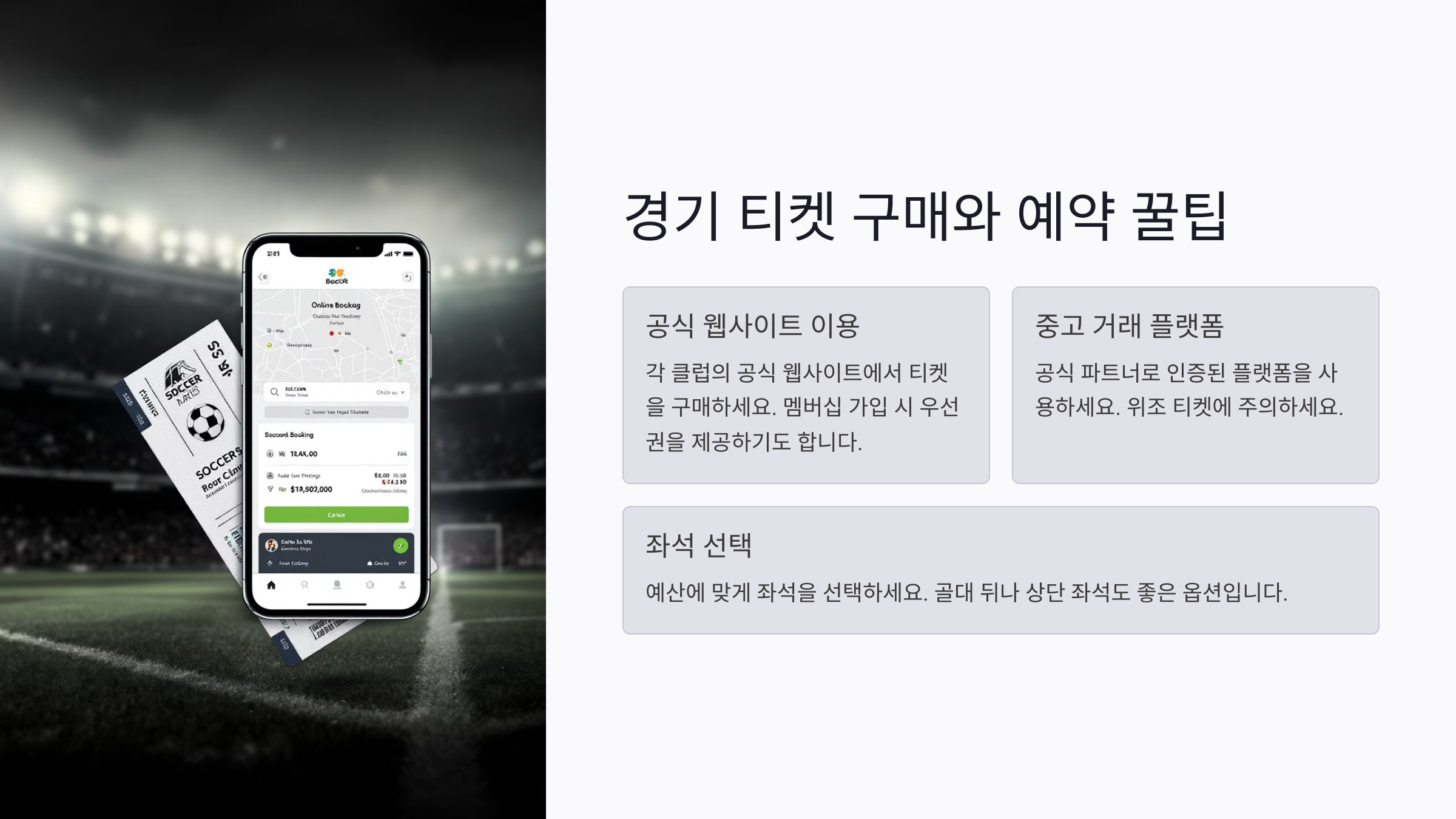 티켓 가격은 좌석에 따라 차이가 나요. 중앙 좌석은 경기를 가장 잘 볼 수 있는 위치지만 가격이 높을 수 있으니 예산에 맞게 선택하세요. 반면, 골대 뒤나 상단 좌석은 비교적 저렴하면서도 현장의 열기를 충분히 느낄 수 있는 좋은 옵션이에요.