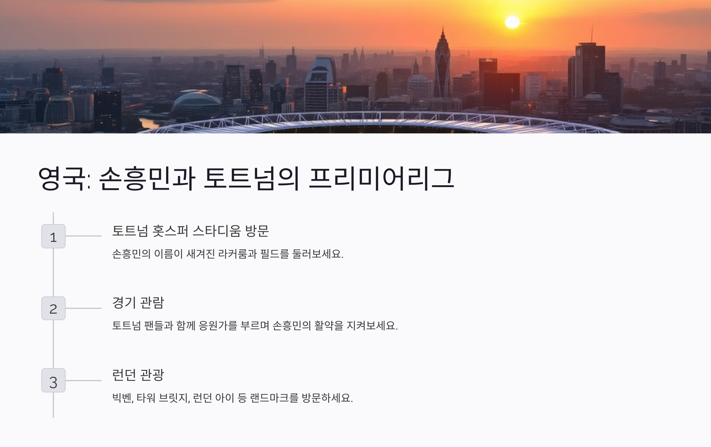 런던에 도착하면 가장 먼저 토트넘 홋스퍼 스타디움을 방문해보세요. 스타디움 투어에서는 손흥민의 이름이 새겨진 라커룸, 경기장 필드, 그리고 팀의 역사가 전시된 박물관을 둘러볼 수 있어요. 손흥민이 실제로 뛰는 필드를 가까이서 경험하면 감동이 배가될 거예요.