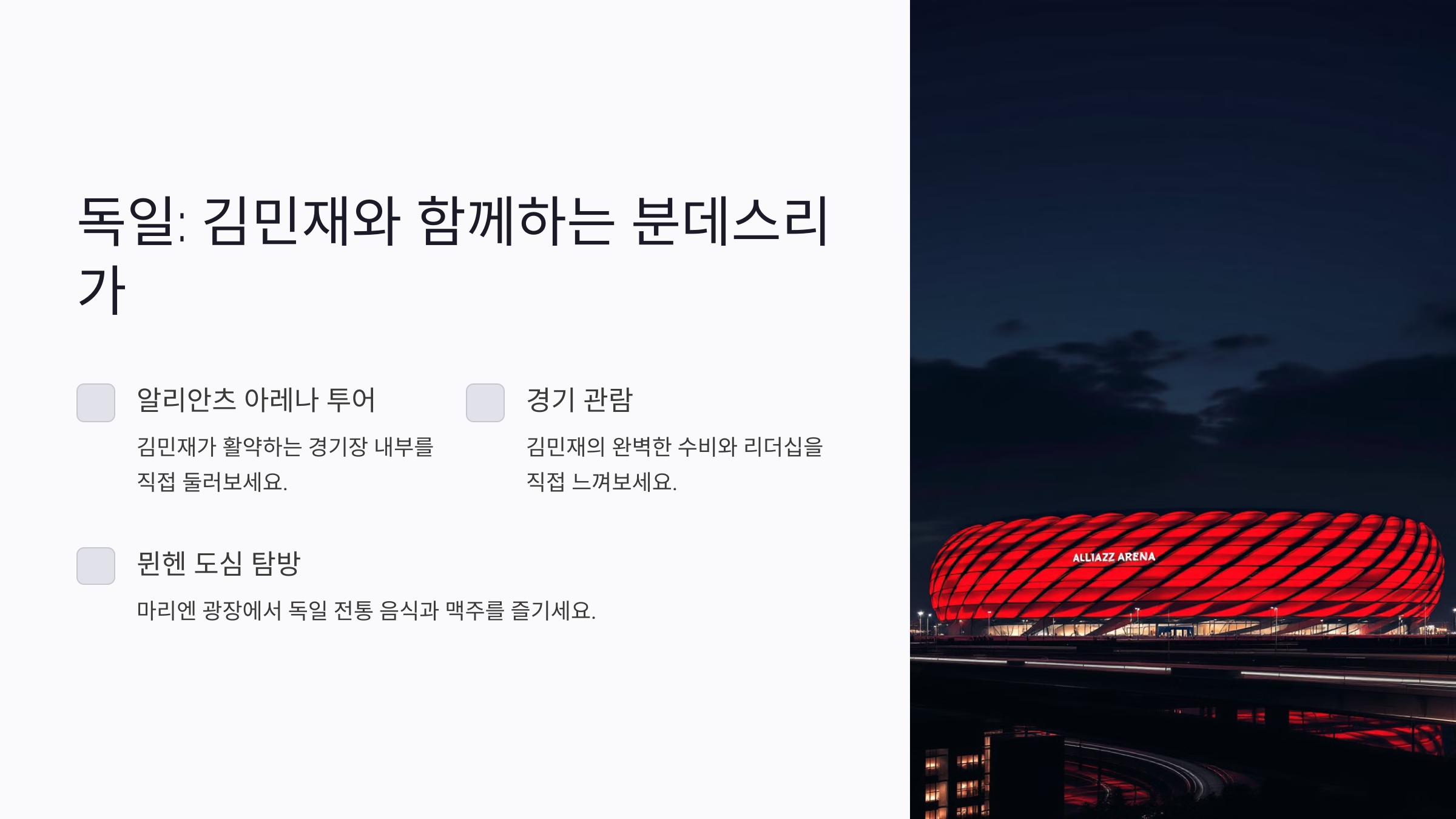 여행 첫날, 알리안츠 아레나 투어로 김민재가 활약하는 경기장을 직접 둘러보세요. 라커룸, 선수 터널, VIP 라운지 등 경기장 내부를 탐방하며 FC 바이에른의 역사를 느낄 수 있어요. 투어 후에는 팬샵에서 김민재의 유니폼을 구매해보는 것도 추천해요!