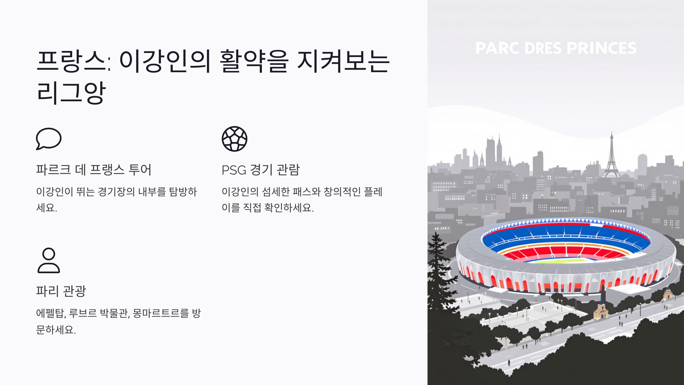 파리의 파르크 데 프랭스는 이강인의 창의적인 플레이가 펼쳐지는 무대로, PSG의 역사를 담은 박물관과 팬샵은 꼭 들러야 할 곳이에요. 투어를 마친 뒤에는 몽마르트르, 에펠탑, 루브르 박물관 등 파리의 유명 명소를 탐방하며 축구 여행을 한층 더 특별하게 만들어 보세요.