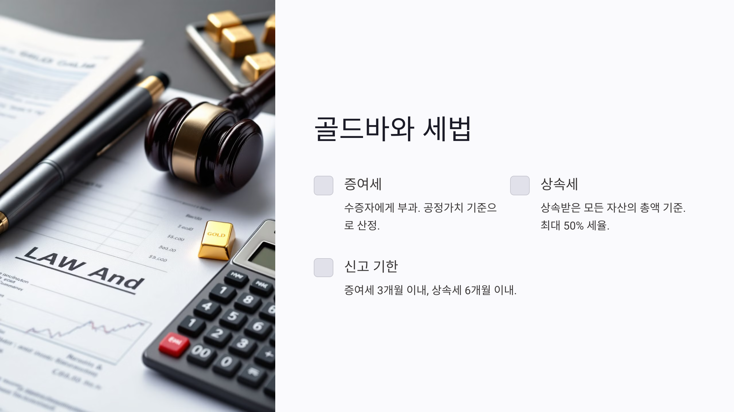 하지만 골드바를 증여하거나 상속할 때는 반드시 세법을 고려해야 해요. 관련 세금과 법적 규정이 자산 이전 과정에 영향을 미칠 수 있기 때문인데요. 이 글에서는 골드바 증여와 상속에 대한 국내 세법, 절세 전략, 법적 이슈까지 상세히 알아볼게요.