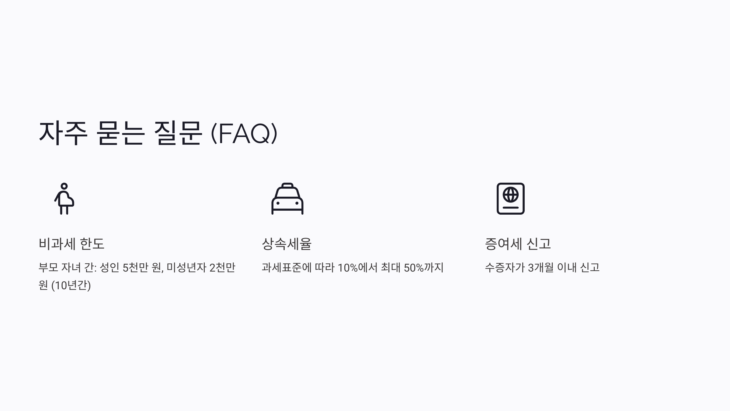 A1. 부모 자녀 간 증여는 성인 5천만 원, 미성년자 2천만 원까지 10년간 비과세가 적용돼요.