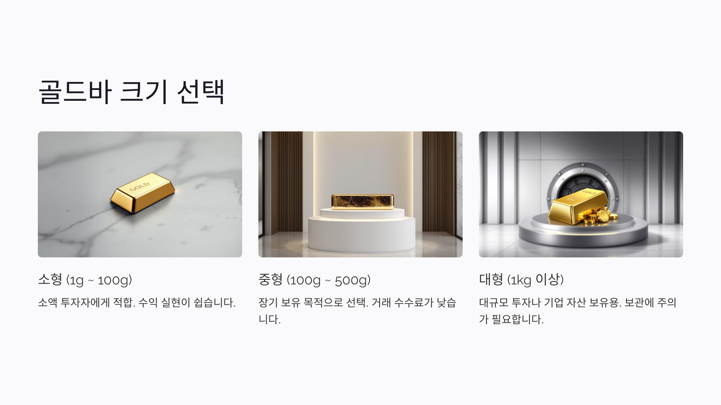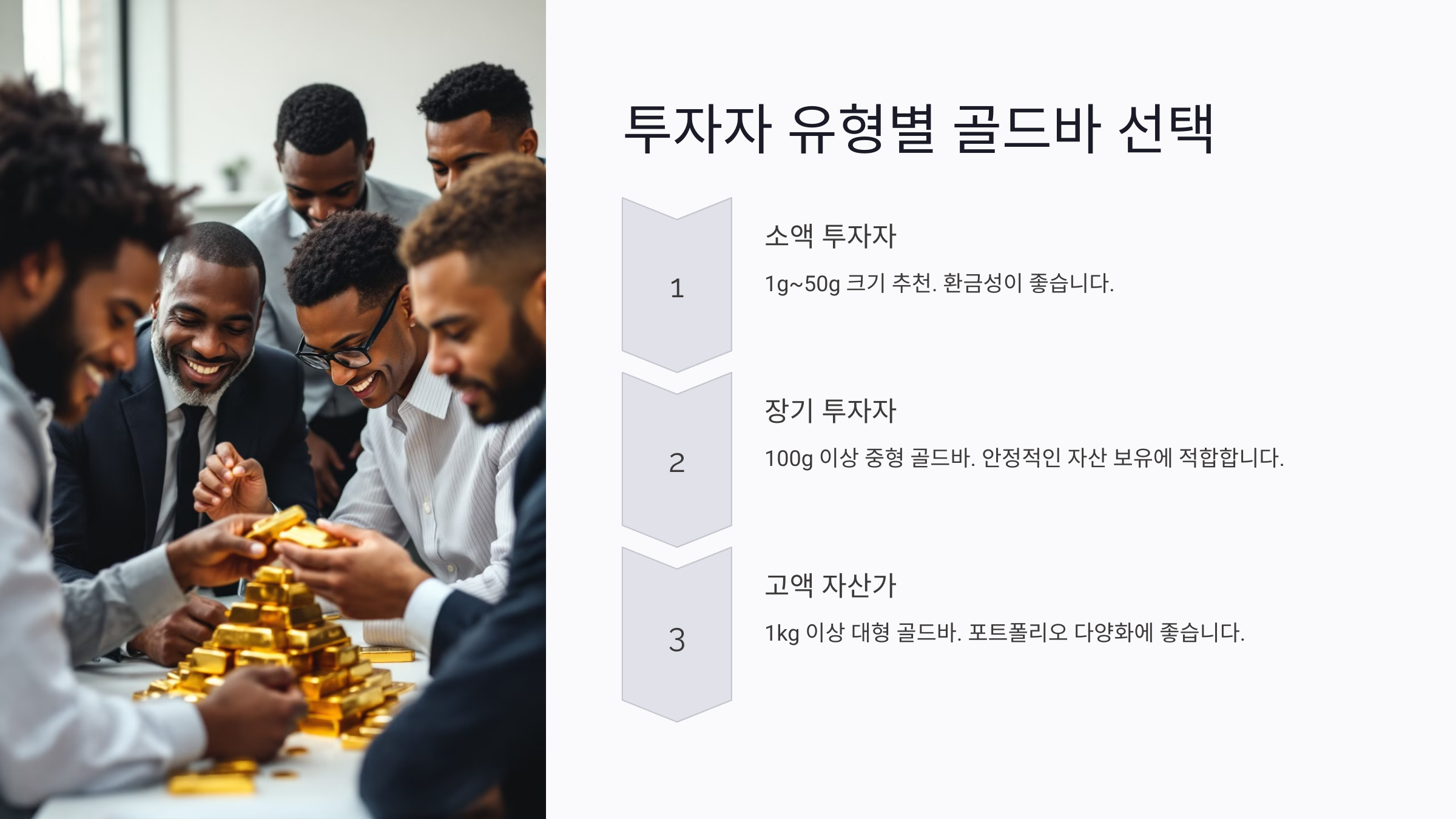3. 고액 자산가: 포트폴리오 다양화를 목적으로 한다면 1kg 이상의 대형 골드바를 선택할 수 있어요. 하지만 보관 문제와 이동성도 함께 고려해야 해요.