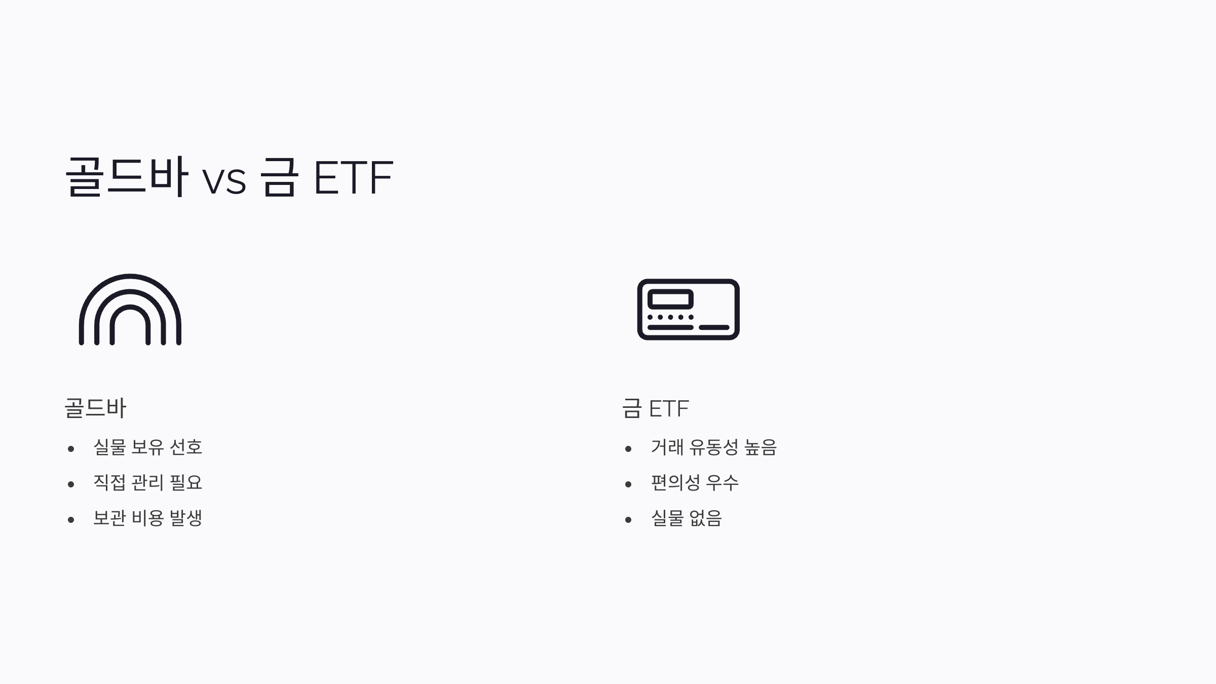 A7. 실물 보유를 선호한다면 골드바가, 거래 유동성과 편의성을 원한다면 금 ETF가 더 적합해요.