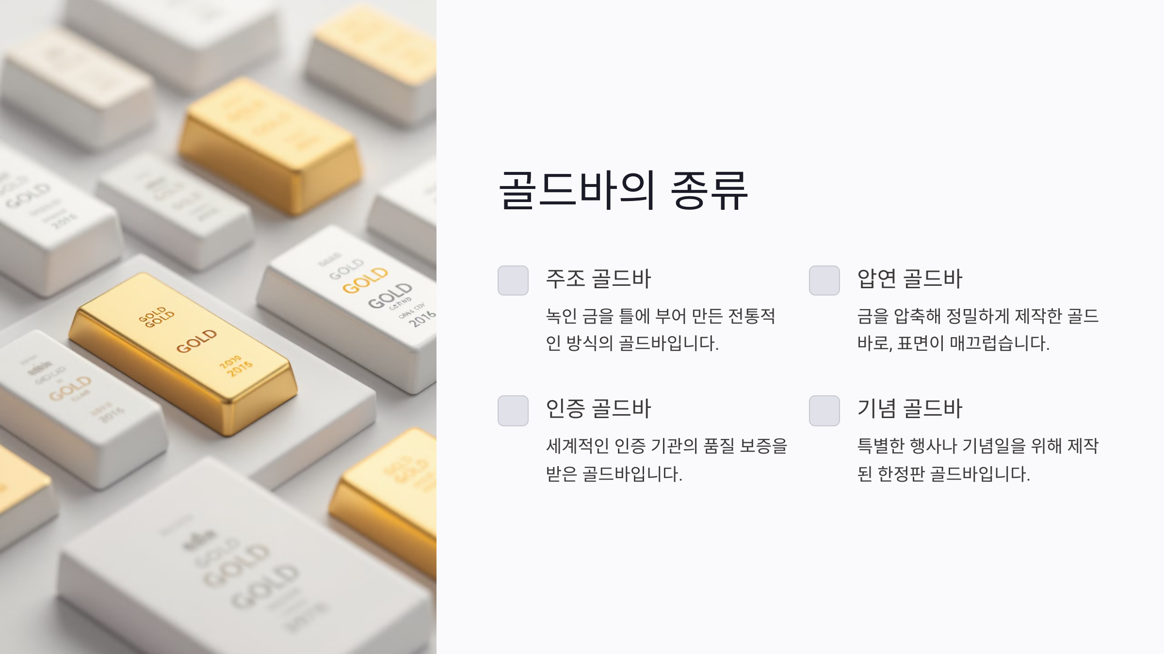 골드바는 형태, 제작 방식, 인증 기관 등에 따라 다양한 종류로 나뉘어요. 대표적으로 아래와 같은 종류가 있어요.