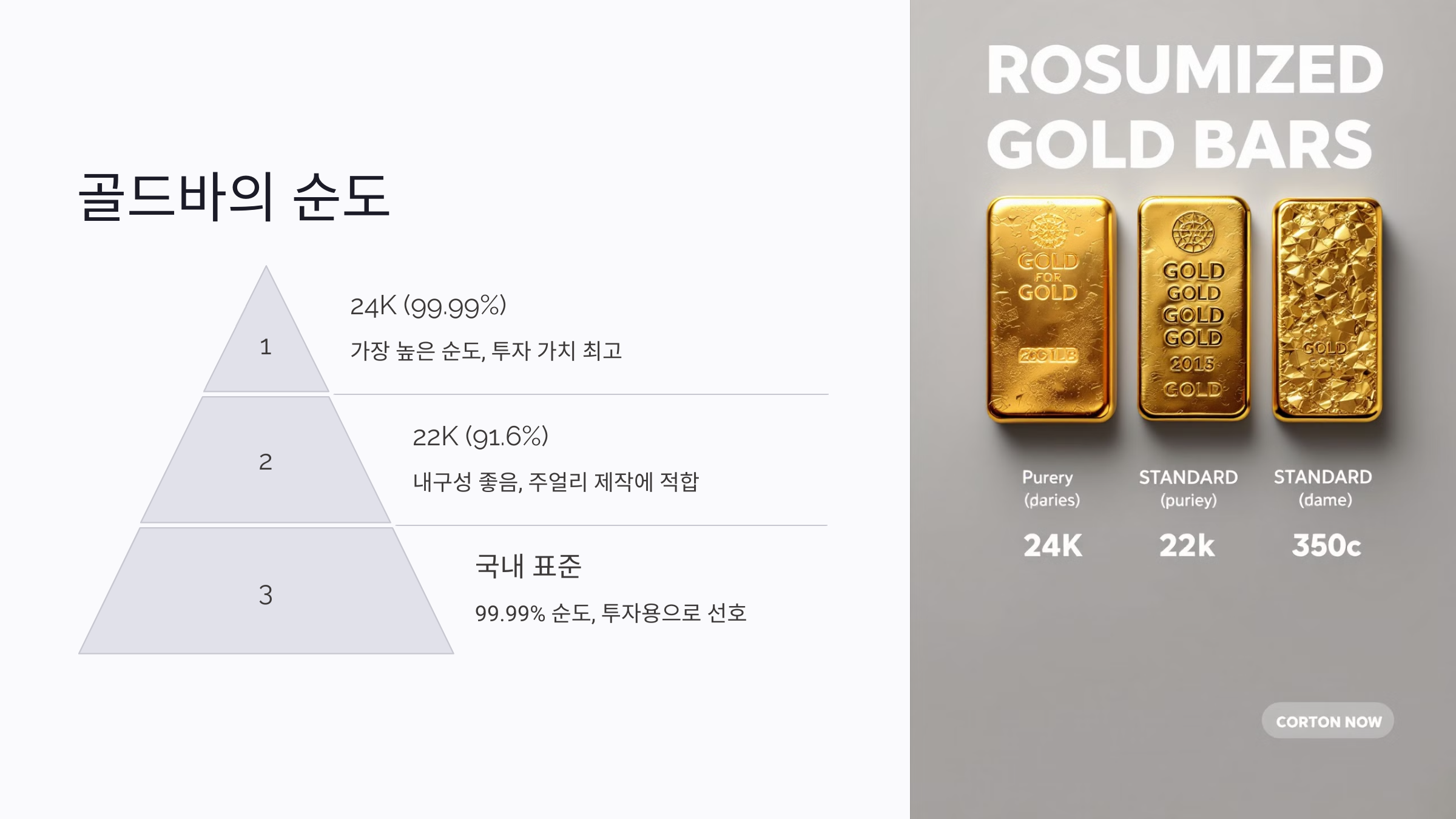 1. 24K 골드바 (99.99%): 가장 높은 순도의 골드바로, 투자 가치가 가장 높고 국제 거래에서 표준으로 인정받아요. 주로 투자용으로 선택돼요.