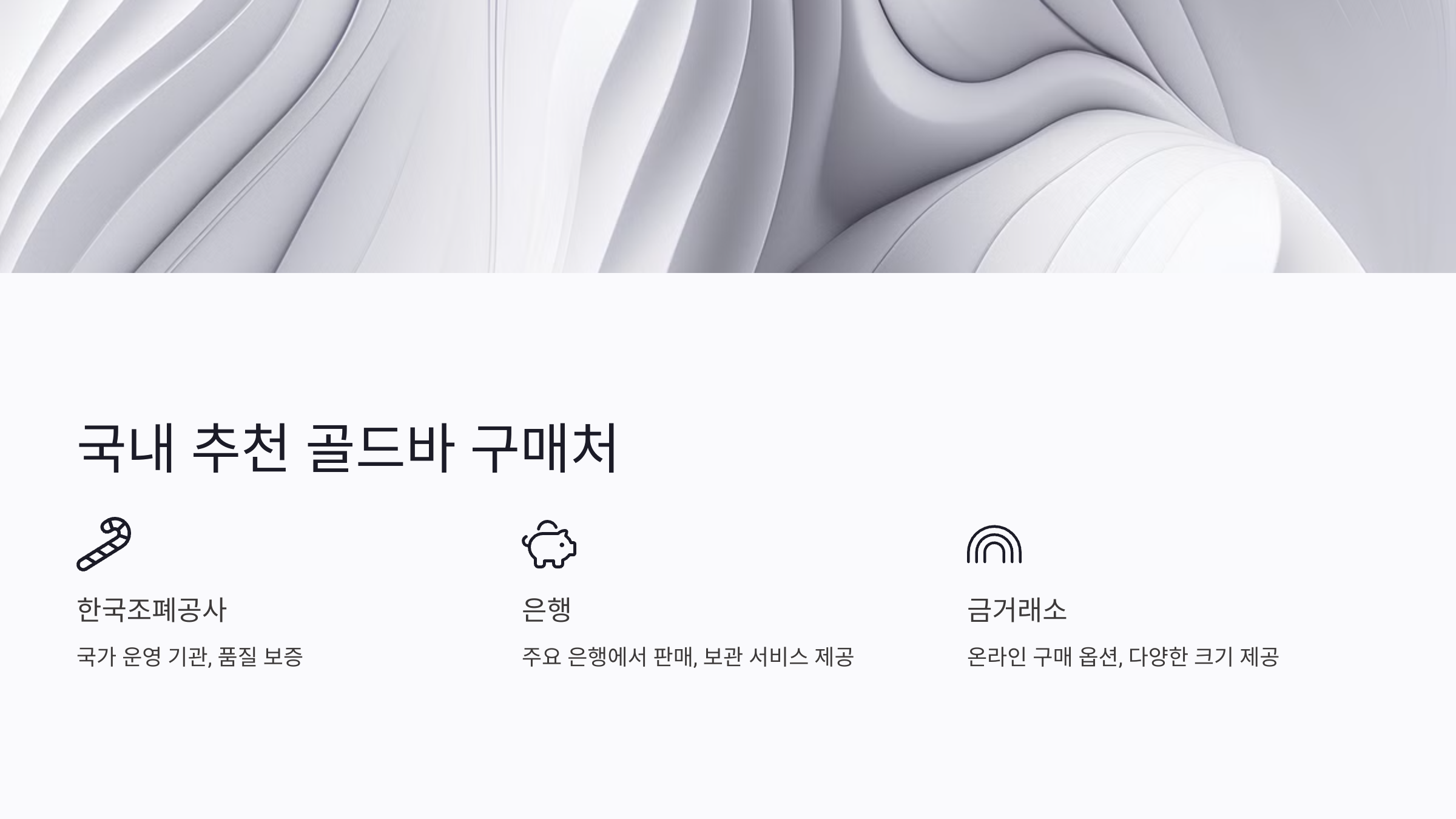 1. 한국조폐공사: 국가에서 운영하는 공공 기관으로, 품질 보증과 함께 안전한 구매를 제공해요. 특히 99.99% 순도의 골드바를 다양한 크기로 판매해요.