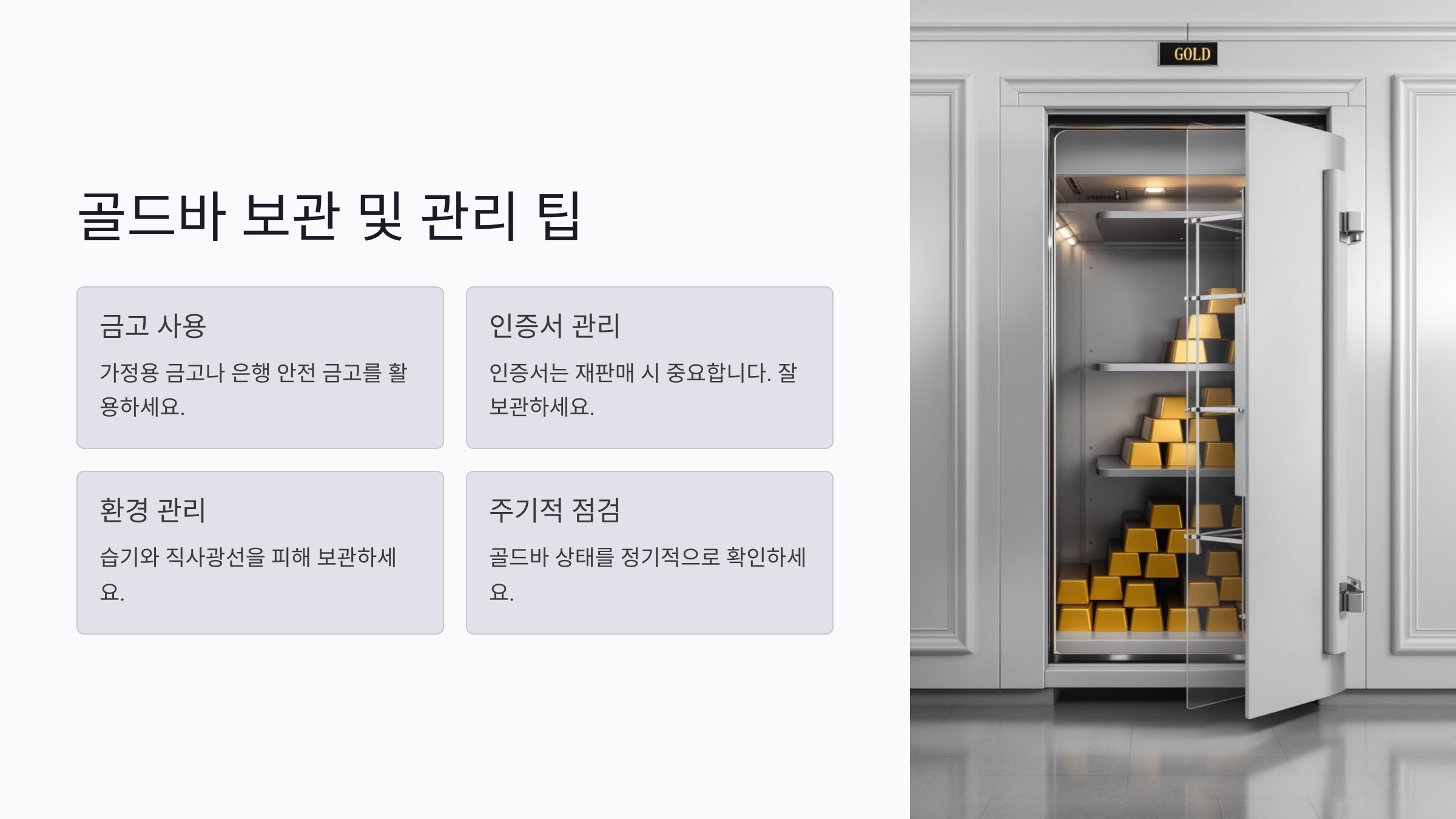 골드바는 실물 자산이기 때문에 보관 및 관리가 매우 중요해요. 안전한 보관을 위해 아래의 팁을 참고하세요.