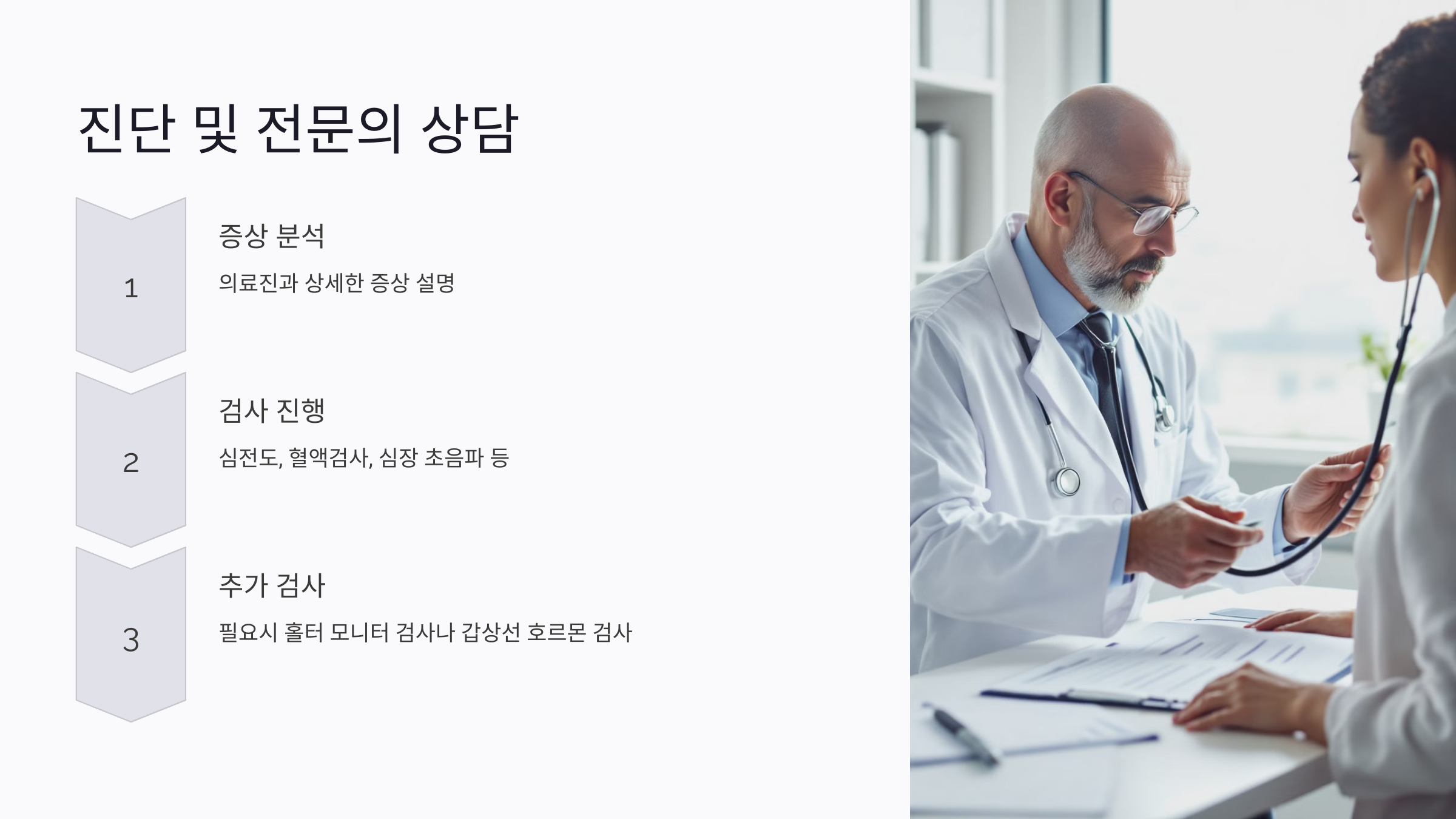 심장 두근거림이 자주 발생하거나 증상이 악화된다면, 반드시 전문의를 찾아 정확한 진단을 받아야 해요. 의료진은 증상을 분석하고 심전도(EKG), 혈액검사, 또는 심장 초음파와 같은 검사를 통해 원인을 파악할 수 있어요.
