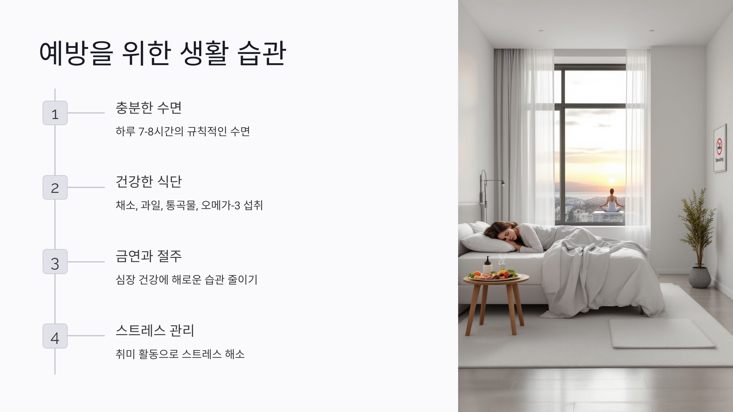 심장 두근거림을 예방하려면 무엇보다도 꾸준한 생활습관 관리가 중요해요. 우선 정기적인 수면 패턴을 유지하며 하루 7~8시간의 충분한 수면을 확보하는 것이 좋아요. 수면은 심박수를 안정시키고 스트레스를 줄이는 데 중요한 역할을 해요.