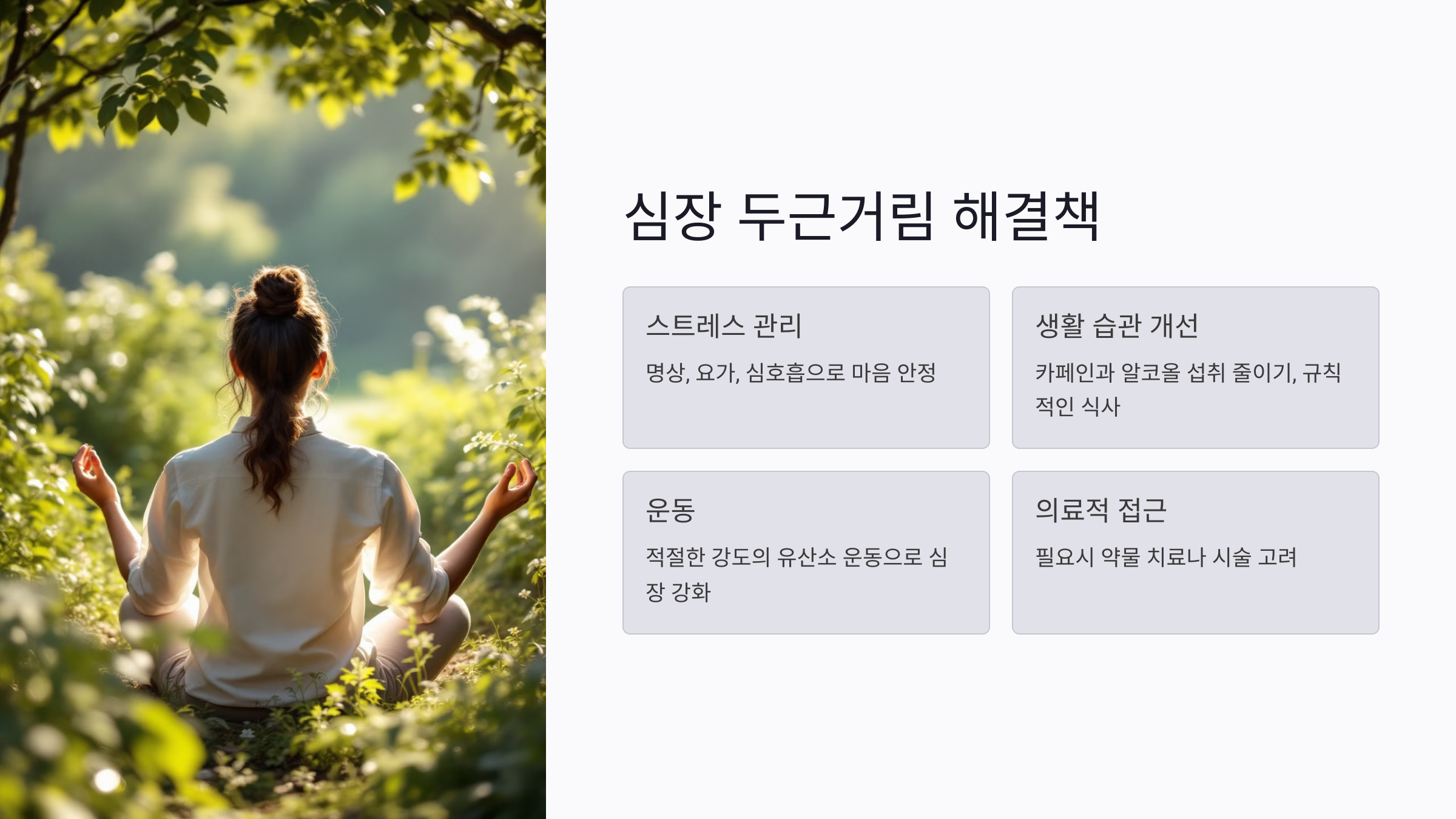 심장 두근거림을 완화하기 위해서는 우선 원인을 정확히 파악하는 것이 중요해요. 스트레스가 원인이라면 명상, 요가, 심호흡 같은 이완 기술을 활용해 마음을 안정시키는 것이 좋아요. 긴장을 푸는 간단한 습관만으로도 심박수가 눈에 띄게 안정될 수 있답니다.