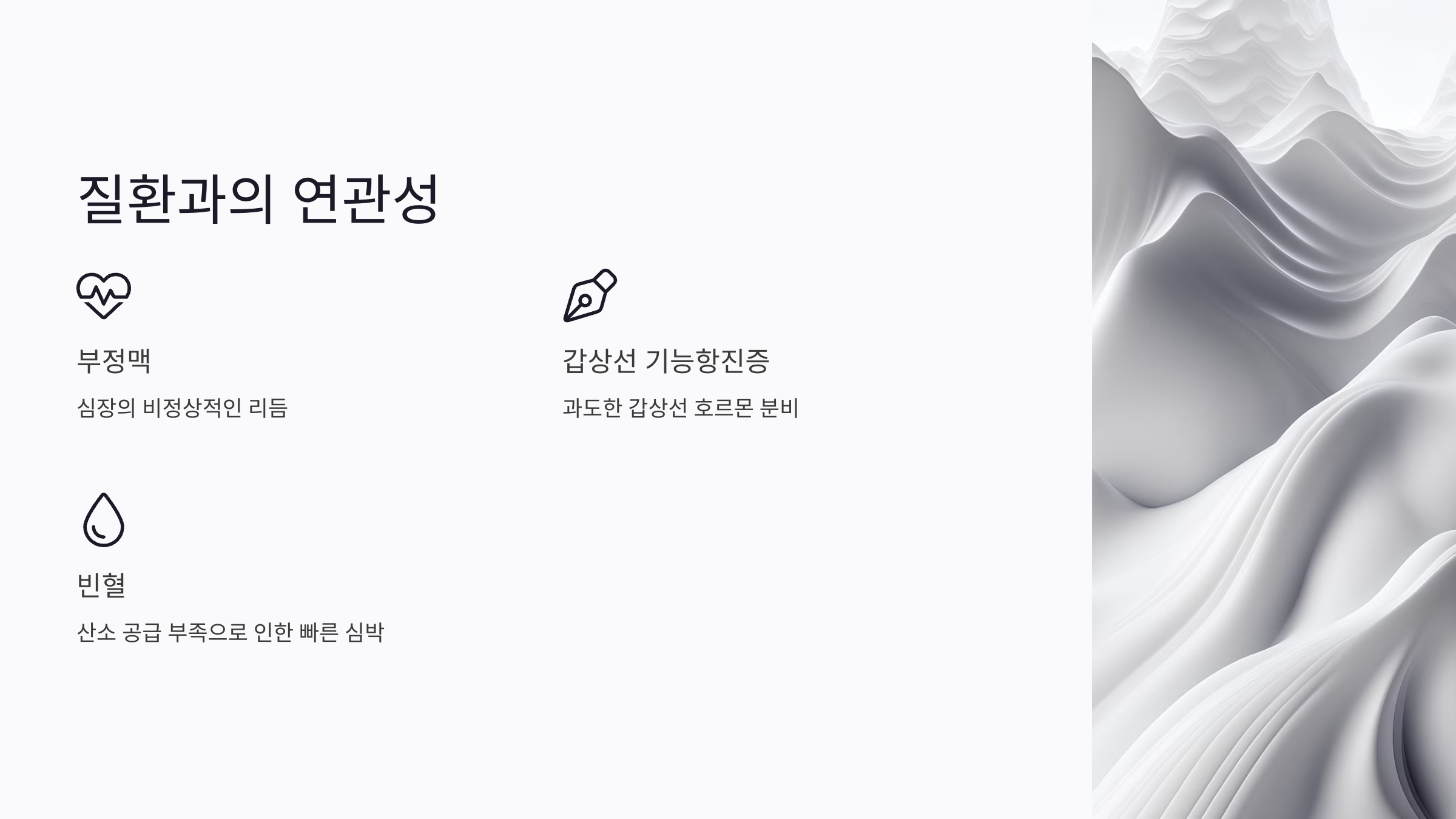 심장 두근거림은 단순한 피로나 스트레스 때문만이 아니라 특정 질환과 관련이 있을 수 있어요. 대표적으로 부정맥은 심장이 정상적인 리듬을 유지하지 못하는 상태로, 빠른 심장 박동(빈맥)이나 느린 심장 박동(서맥)이 발생할 수 있어요.