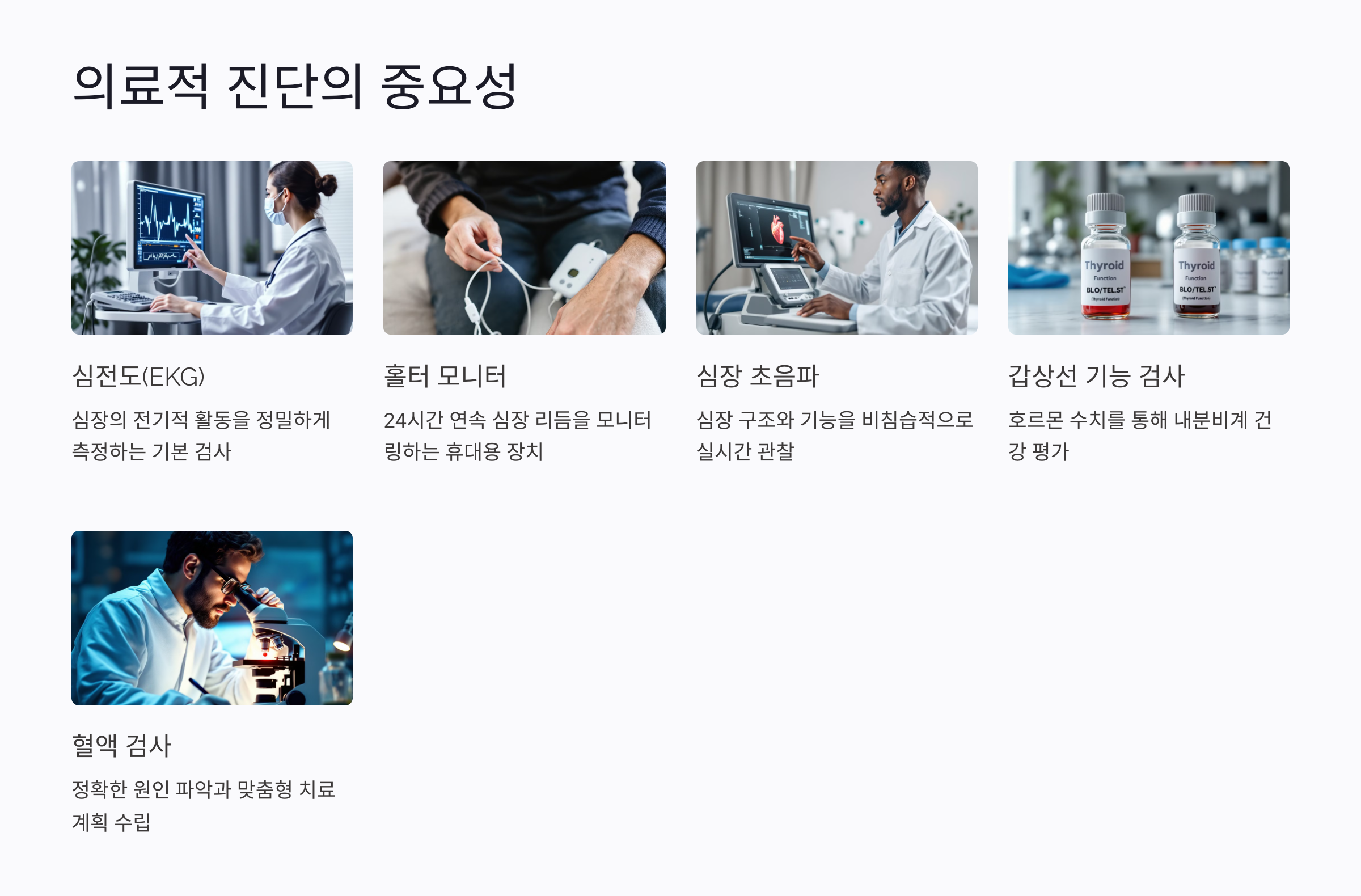 심장 두근거림이 반복적이거나 일상 생활에 불편함을 줄 정도로 심각하다면, 전문적인 진단을 받아야 해요. 병원에서는 심전도(EKG), 홀터 모니터(24시간 심전도 측정), 심장 초음파 등 다양한 검사를 통해 두근거림의 원인을 확인할 수 있어요.
