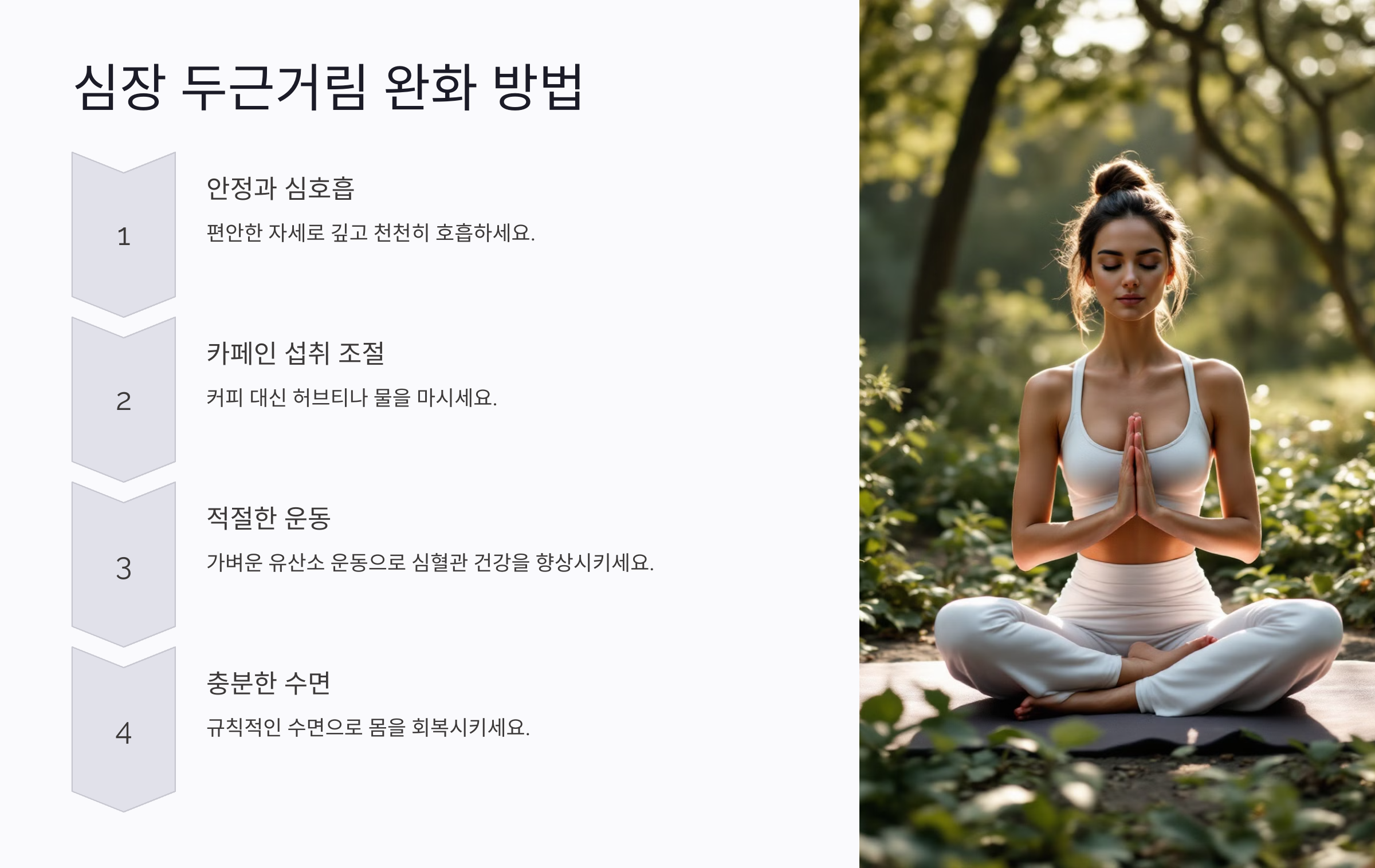 심장 두근거림이 발생했을 때는 우선 몸을 안정시키고 긴장을 푸는 것이 중요해요. 편안한 자세로 앉거나 누운 후, 깊고 천천히 심호흡을 하면 심박수를 낮추는 데 도움이 될 수 있어요. 심호흡은 특히 스트레스나 불안으로 인해 발생한 두근거림에 효과적이에요.