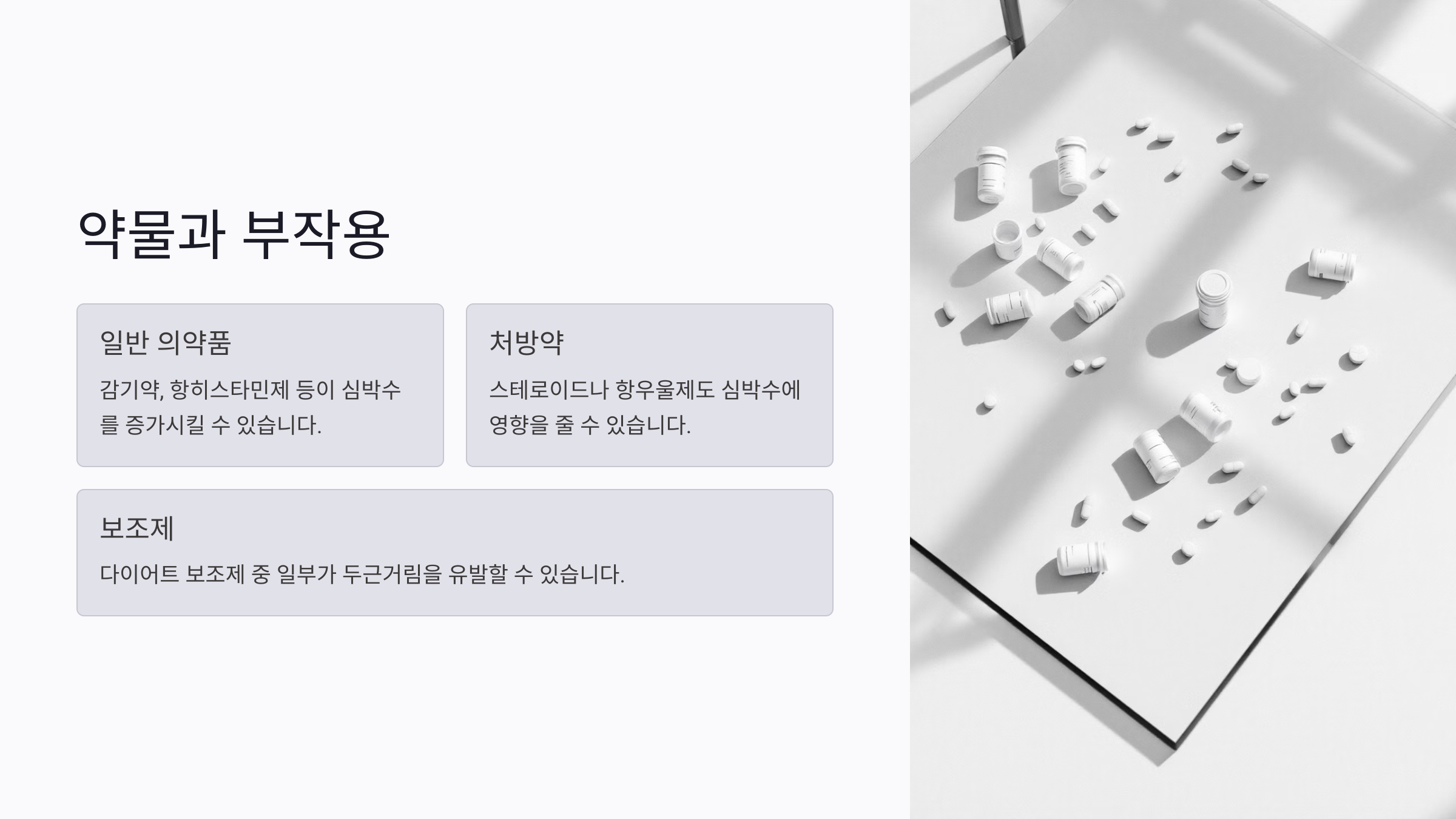스테로이드 계열 약물이나 특정 항우울제도 심박수에 영향을 줄 수 있어요. 만약 약물 복용 후 두근거림이 나타난다면, 복용 중인 약물에 대해 의사나 약사와 상담하는 것이 필요해요.