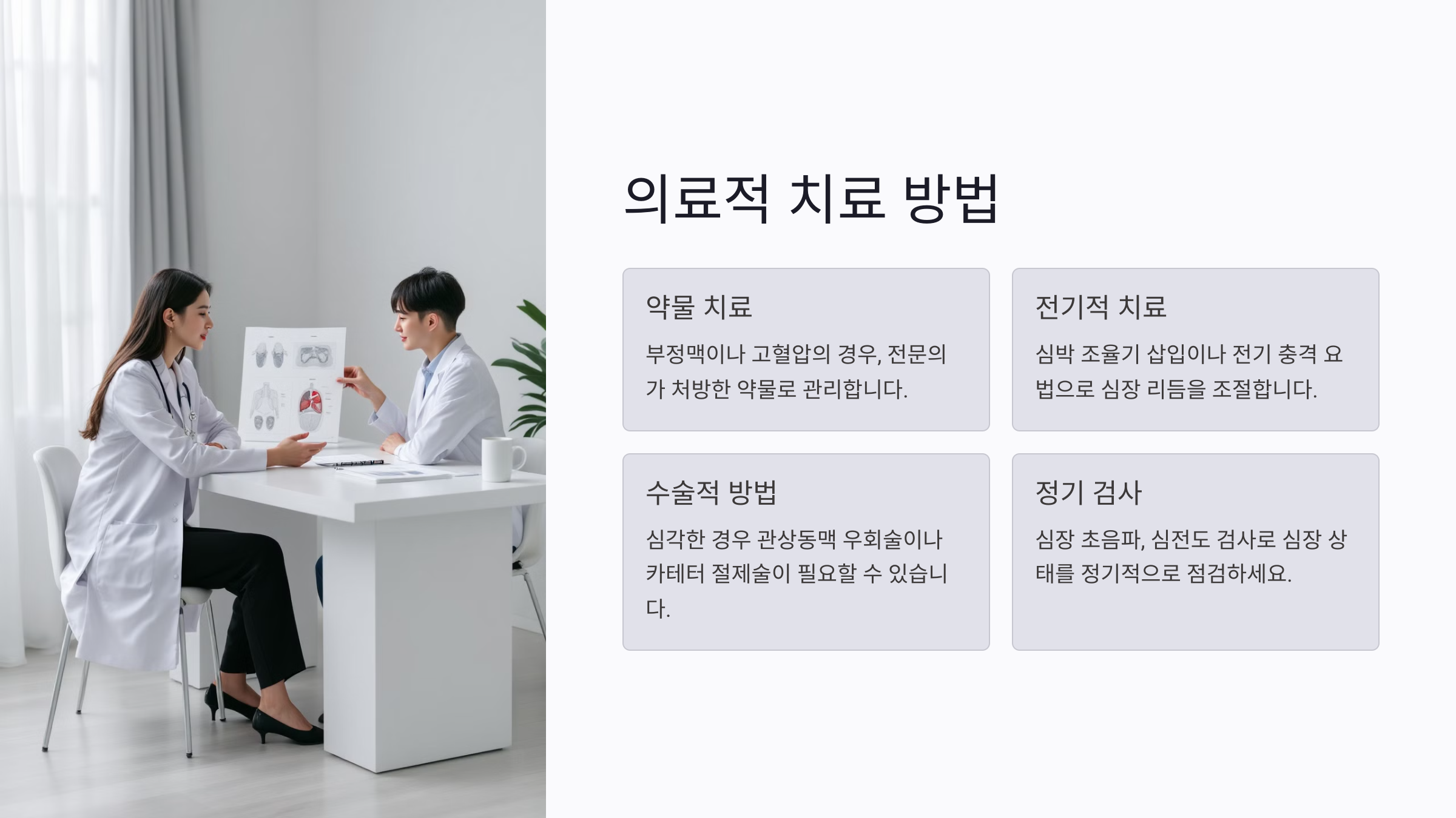 1. 약물 치료: 부정맥 또는 고혈압이 원인인 경우, 전문의가 처방한 약물을 통해 증상을 관리할 수 있어요.