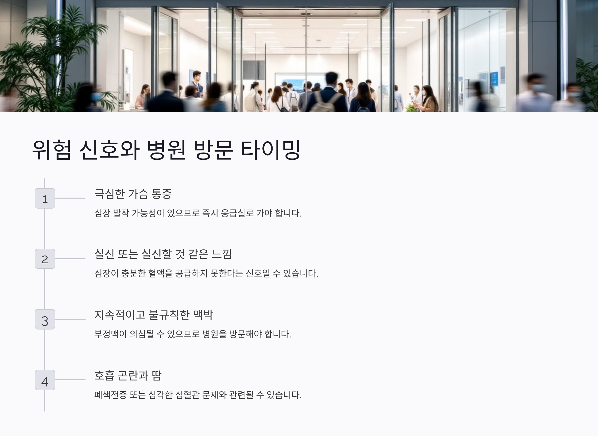 심장 두근거림이 발생했을 때, 증상이 경미한지 아니면 의료적 도움을 필요로 하는지 판단하는 것이 중요해요. 다음 상황에서는 반드시 병원을 방문해야 해요: