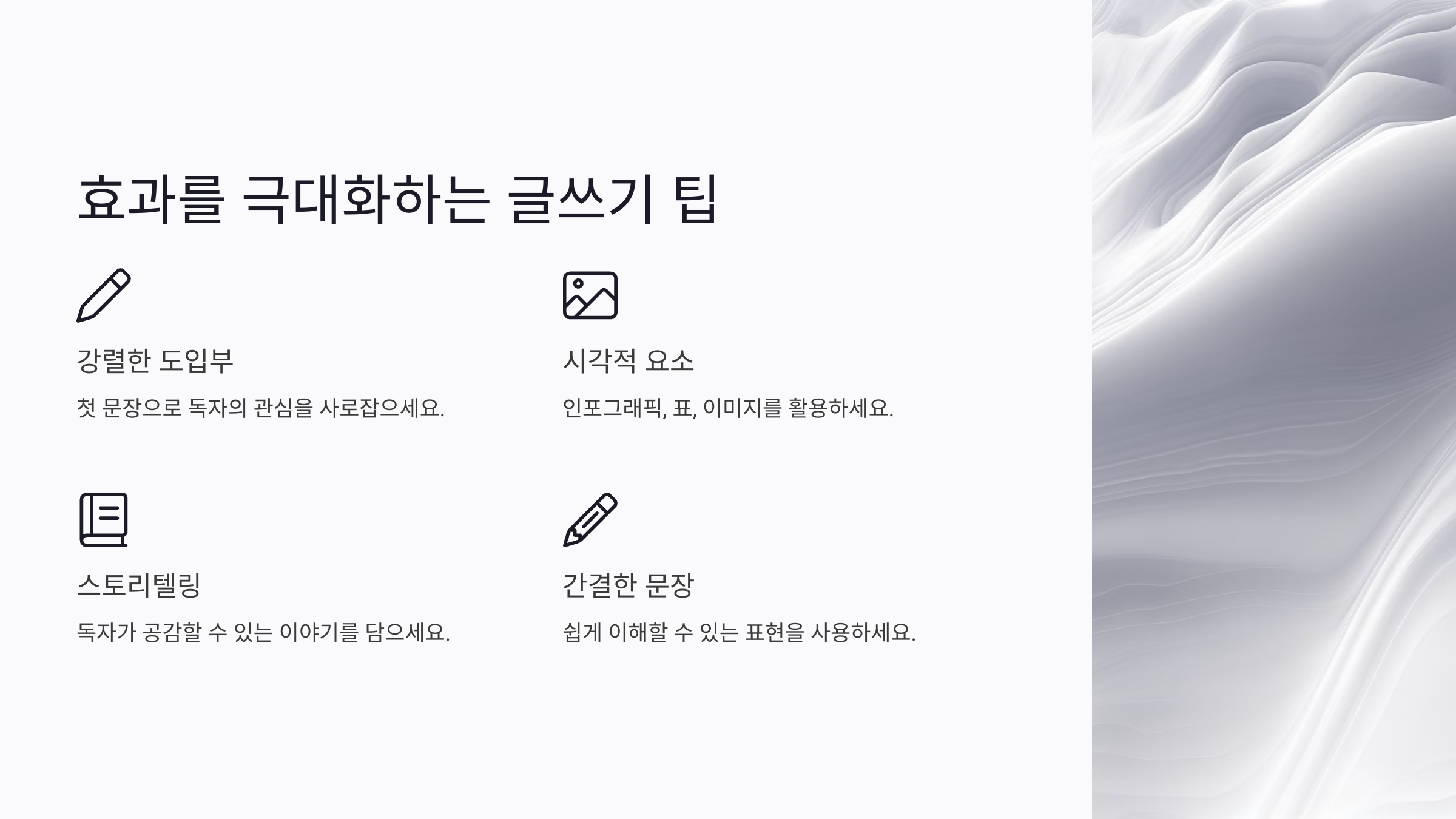 파소나 법칙을 블로그에 적용할 때, 단순히 구조를 따르는 것만으로는 충분하지 않아요. 효과를 극대화하기 위해 몇 가지 글쓰기 팁을 활용하면 좋아요. 이 팁들은 독자의 관심을 유지하고 행동을 유도하는 데 큰 도움을 줄 거예요.