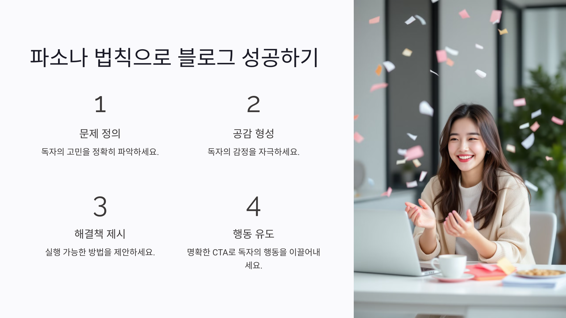 이처럼, 파소나 법칙은 단순한 판매 전략을 넘어 블로그 글의 목적을 달성하기 위한 강력한 구조를 제공해요. 적절히 활용하면 독자가 글을 끝까지 읽고, 원하는 행동을 하게 되는 확률이 훨씬 높아진답니다.