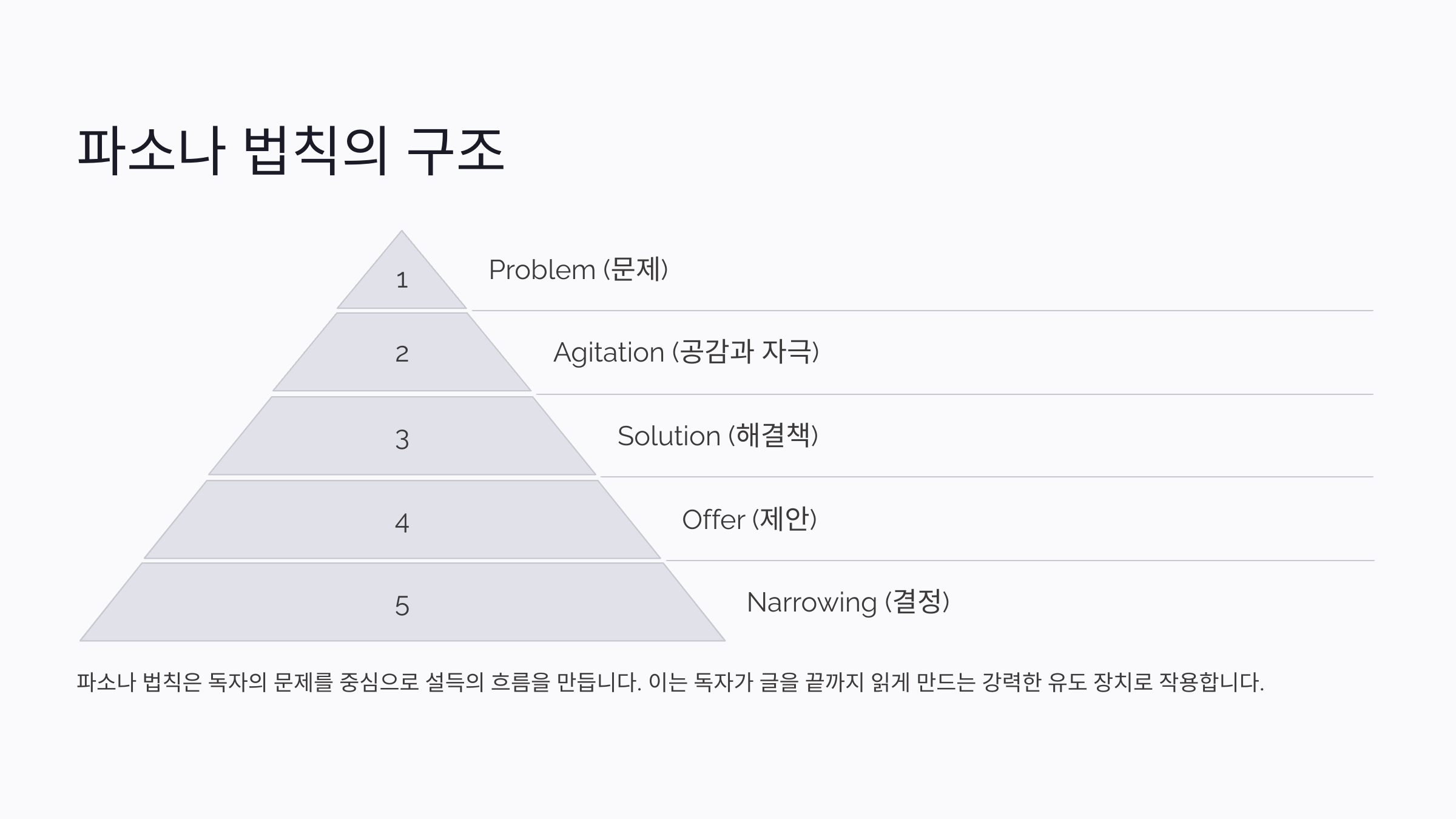파소나 법칙은 일본의 유명 마케팅 전문가 다니엘 카츠(Daniel Kats)가 설계한 프레임워크로, 고객의 문제를 해결하는 과정에서 자연스럽게 행동을 유도하는 방식이에요. 이 법칙의 구조는 Problem(문제), Agitation(공감과 자극), Solution(해결책), Offer(제안), Narrowing(결정), Action(행동)으로 구성돼요.